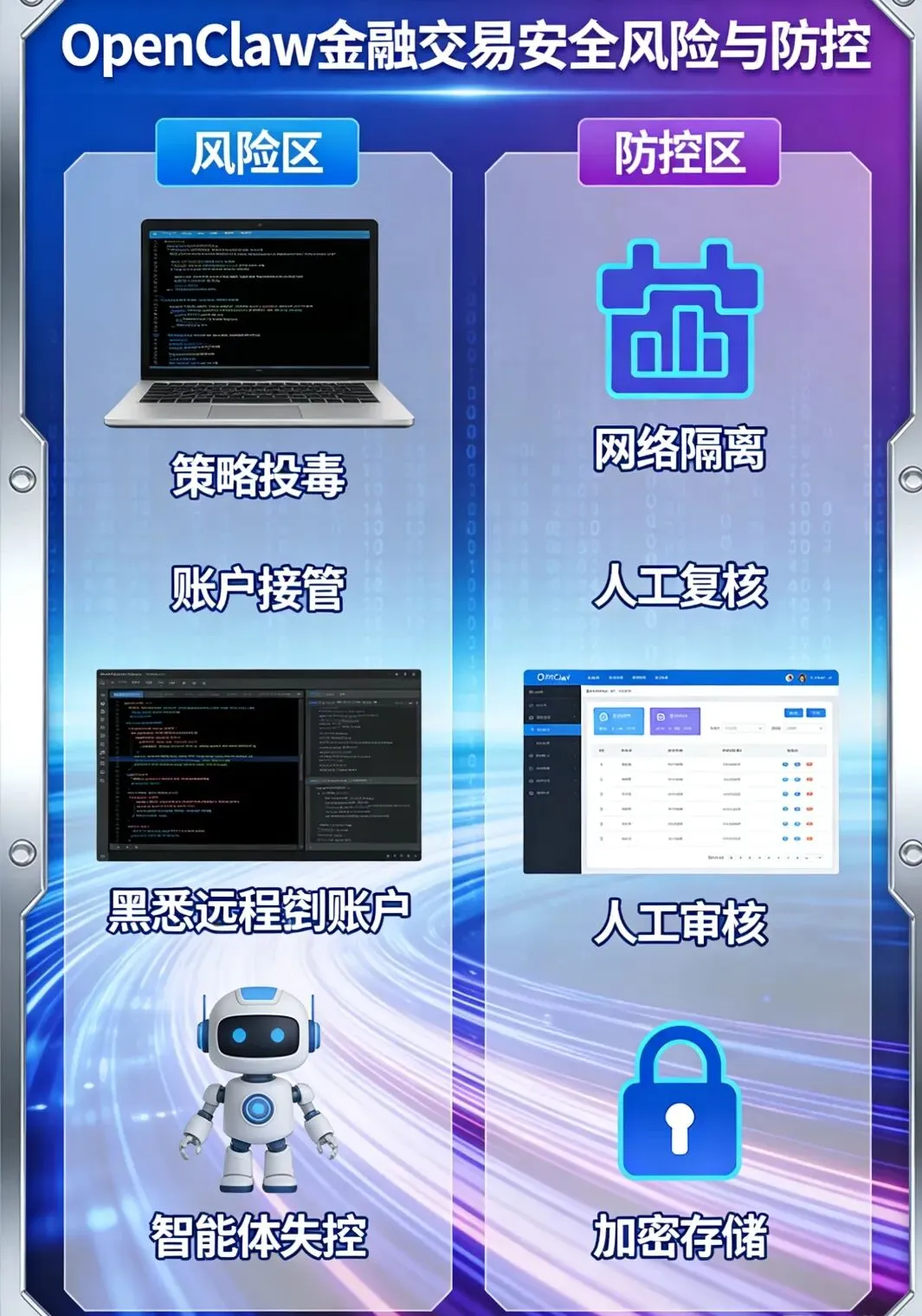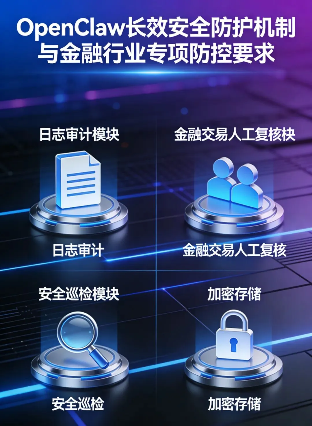 7. 金融行业专项防控要求:金融机构、量化交易团队等,必须严格遵守金融监管部门的各项规定,严禁将OpenClaw等开源智能体直接接入生产交易系统;所有交易指令必须经过人工复核,设置严格的熔断机制、止损限额与应急处置方案,严禁无人工干预的全自动交易;交易API密钥、账户信息等核心敏感信息,必须采用国密级加密存储,严格管控访问权限,严禁明文存储或交由智能体自动管理。