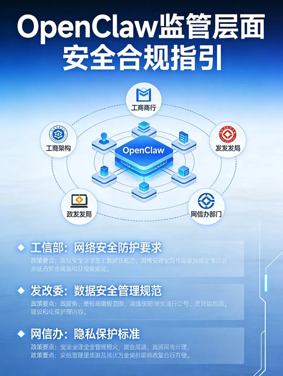 明确安全底线,划定合规红线 国家相关监管部门已针对人工智能与智能体安全,出台了一系列法律法规与政策指引,明确了各方的安全责任与合规要求,为OpenClaw的规范使用划定了底线。 - 工业和信息化部:作为人工智能与网络安全行业的主管部门,工信部NVDB平台专门针对OpenClaw安全风险,组织智能体提供商、漏洞收集平台、网络安全企业等机构,开展专项风险研判,发布安全预警,提出“六要六不要”核心安全指引,为各类用户规范使用OpenClaw提供了明确的操作规范。同时,工信部在《人工智能产业高质量发展行动计划》等政策中,明确要求人工智能产品与服务必须落实安全主体责任,强化全生命周期安全管理,防范化解各类安全风险。