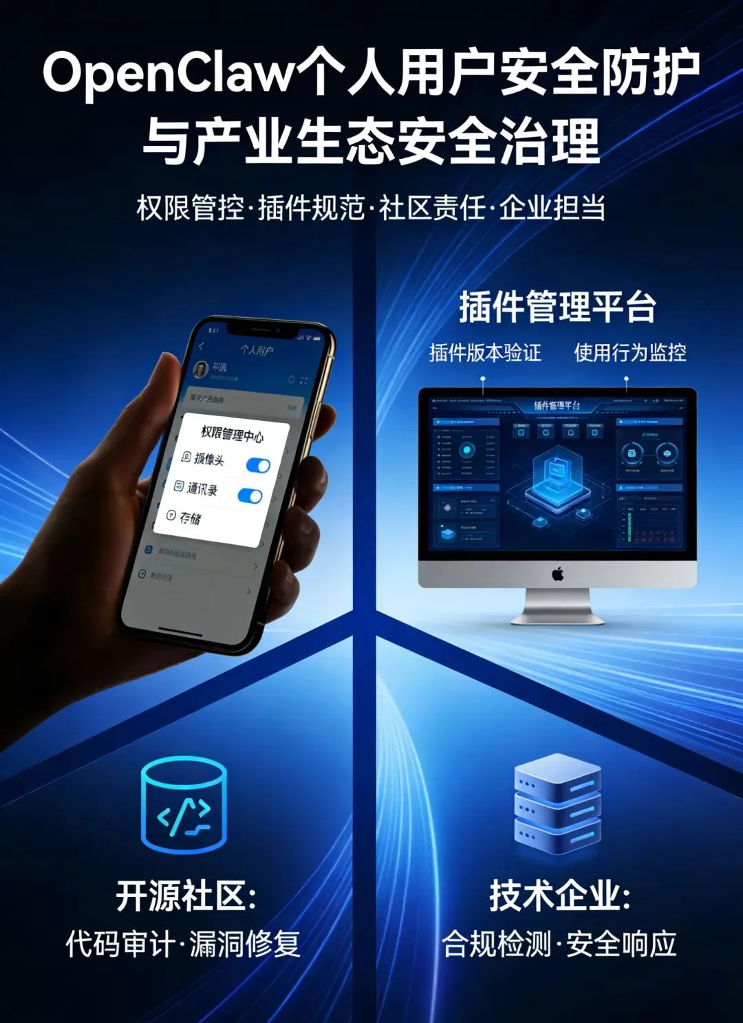 国家发展和改革委员会:在《“十四五”数字经济发展规划》《加快人工智能产业创新发展实施方案》等政策中,明确提出要坚持发展和安全并重,构建人工智能安全治理体系,加强开源人工智能技术与产品的安全管理,完善风险防控机制,推动人工智能产业健康可持续发展。- 国家网信办、公安部等部门:通过《中华人民共和国网络安全法》《中华人民共和国数据安全法》《中华人民共和国个人信息保护法》《生成式人工智能服务管理暂行办法》等法律法规,构建了完善的法律监管框架,明确了开源项目运营方、智能体使用方、数据处理者的法定安全责任,要求各类主体必须落实网络安全与数据保护义务,否则将承担相应的民事、行政乃至刑事责任。