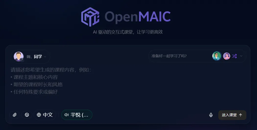 OpenMAIC 能够根据用户需求一键生成包含AI老师、AI同学互动的沉浸式课程,旨在提供高度自主、个性化的学习体验。