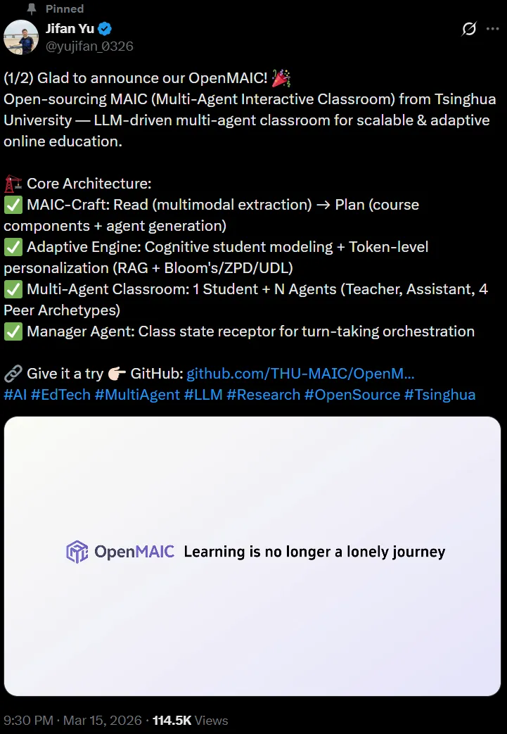 OpenMAIC 是由清华大学研究团队历经 2 年打磨的 AI 课堂平台,该项目开源仅数小时,X 上已经引发了十几万人关注。