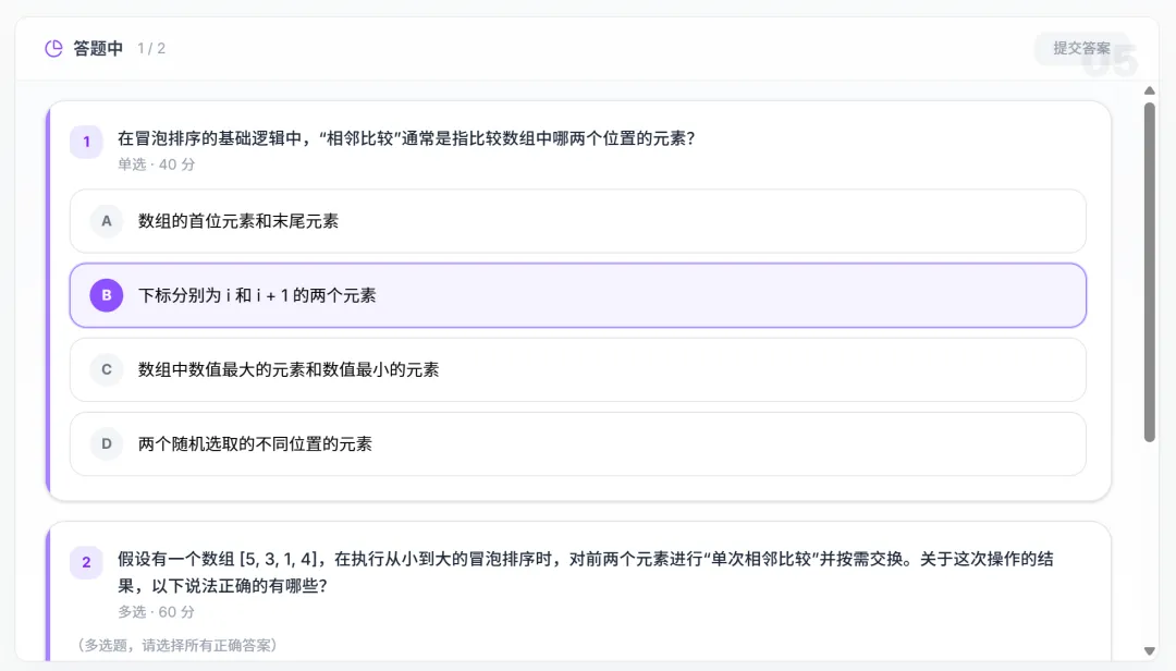 例如,计算机专业的大一学生,让 OpenMAIC 给我们来讲讲冒泡排序算法。