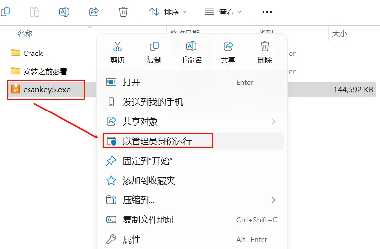 2.进入解压目录,右键点击“esankey5.exe”选择“以管理员身份运行”