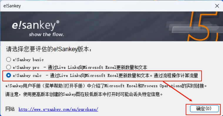 12.在弹出窗口中选择“e!Sankey calc通过LiveLinks向Microsoft Excel更新数量和文本。通过流程操作计算流量”,点击“确定”
