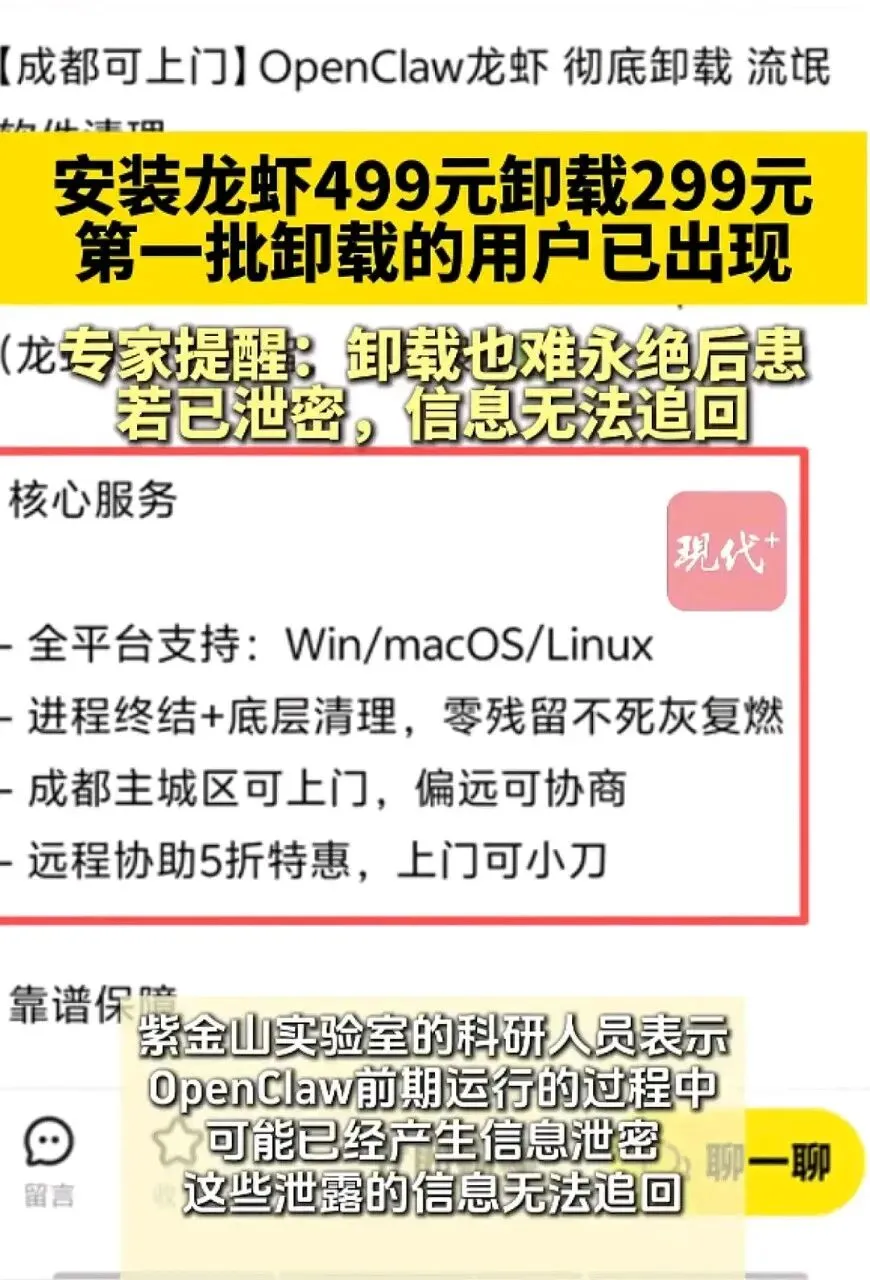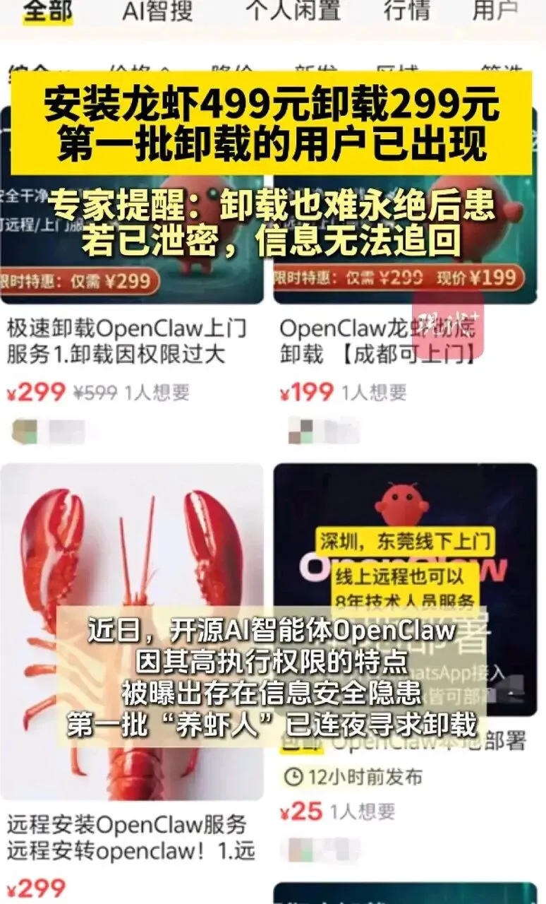 “周五求安装,周一求卸载。”一位兼职做“龙虾清理”的技术人员在社交平台上晒出了自己的新业务。二手交易平台上,“上门卸载OpenClaw”的服务悄然上架,报价从29.9元到299元不等。广告语充满戏谑:“一次上门、彻底卸载,守护最好的人类”“专治AI上瘾症、Token耗尽焦虑”。