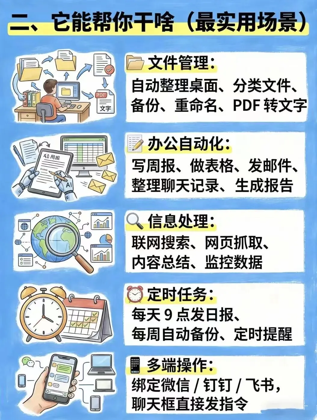 简单说,它是会动手干活的AI伙伴。不像普通聊天工具只能闲聊,OpenClaw有“钳子”(技能),能帮你整理文件、自动处理任务、操控电脑,甚至能通过微信、飞书等平台和你互动,妥妥的专属“数字打工人”!