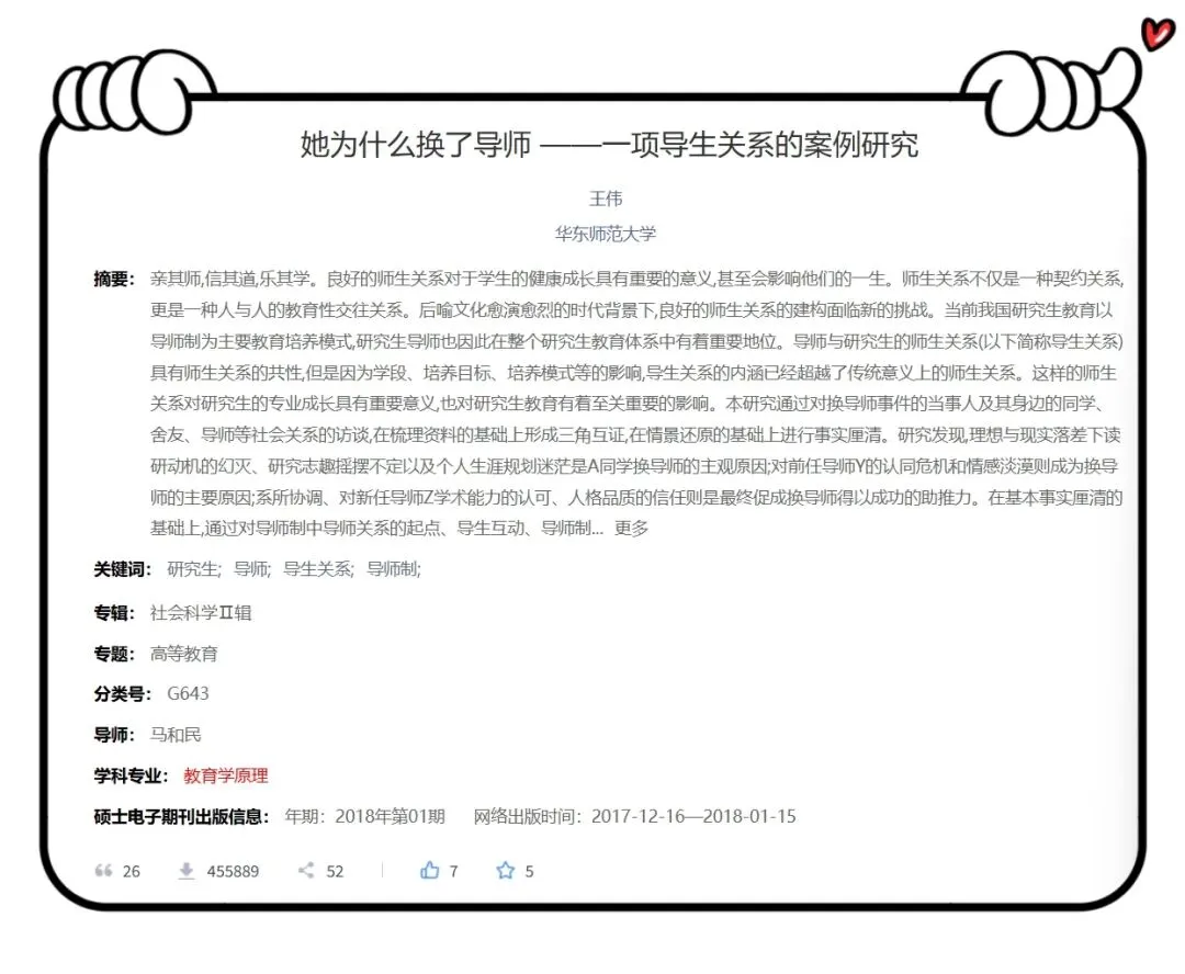 这篇论文本质上是一个教育学案例研究,通过访谈还原了一名女研究生“换导师”的全过程,包括:被“分配”到导师(类似开盲盒);与导师在选题、沟通方式等方面冲突;导师情绪化或控制性强;学生逐渐失去自主性与安全感;最终在外部帮助下更换导师。它不是爆料文,而是试图用一个具体案例分析“导生关系”。 一是导师权力过大(核心问题)。在现实中,导师往往掌握论文是否通过;是否允许毕业;推荐信、资源、项目机会。这种结构导致学生对导师高度依附。论文也指出,导师在学生毕业中具有“绝对权力”,学生很难对抗不良关系。 二是导师匹配机制像“开盲盒”。很多高校学生对导师了解极少,分配过程不透明,一旦选错,成本极高。该论文批评这种制度“僵化单一”,缺乏调整空间。结果就是选到好导师 = 幸运;选到问题导师 = 三年受困。 三是“不能轻易换导师”的文化压力。现实中换导师困难,不只是制度问题,还有文化因素,如“师生如父子”的传统观念;换导师被视为“人情问题”;担心被贴标签、影响未来。因此很多学生宁愿忍,也不敢换。论文特别指出,学生评价体系“失声”。 四是导生关系的“情感化”与“异化”。理论上导师关系是学术指导关系,但现实中常变成权力 + 人情 + 情绪混合体。学术指导弱化,控制或放养并存,有些学生甚至面临被忽视(放养型)、被压制(控制型)。 五是研究生扩招带来的结构性压力。近年来,研究生人数增加、导师精力被稀释。所以会导致个性化指导下降,矛盾更容易发生。 原因很现实,那就是 讲了很多人的真实经历很多人看完后觉得: “这不就是我/我同学的故事吗?”此外,写法像“故事”,传播性强。该论文章节标题甚至带有叙事感,被网友称为“学术圈自己的小说”。还有就是它触碰了一个长期被压抑的话题,相比科研成果,这篇论文讨论的是权力关系、学术生态、学生处境。这些问题平时很少被公开表达。 答案是:有的,而且很明显。有人认为该论文偏向学生视角、不够客观,也有人质疑其学术规范性不强,还有人认为学生本身也存在沟通问题。本质上来说,这是一个复杂的人际与制度问题,没有单一的对错。 这篇论文真正“隐藏”的不是八卦,而是一个高度依赖导师、但缺乏制衡机制的研究生培养体系。它之所以火,是因为它让很多人第一次看到导生关系的真实张力、学术体系中的权力结构、学生在其中的弱势位置。