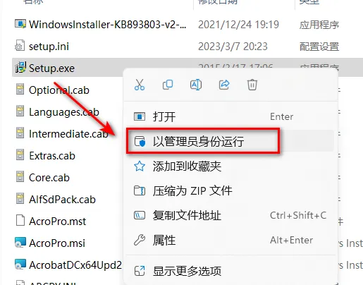 1.鼠标右键解压到“Acrobat DC2023” ![]() 2.双击打开【Setup】文件夹 ![]() 3.找到并选中setup,鼠标右击选择“以管理员身份运行” ![]() 4.点击“自定义” 5.选择软件安装路径,点击“安装” 6.软件正在安装,请耐心等待 7.点击“完成” 8.双击打开【Crack】文件夹 ![]() 9.选中Crack,鼠标右击选择“以管理员身份运行” ![]() 10.点击“OK” ![]() 11.在开始菜单里,找到并启动软件 ![]() 12.选择在停用保护模式的情况下...,点击“确定” ![]() 13.选择总是在停用保护模式的情况下打开,点击“确定” ![]() 14.安装结束