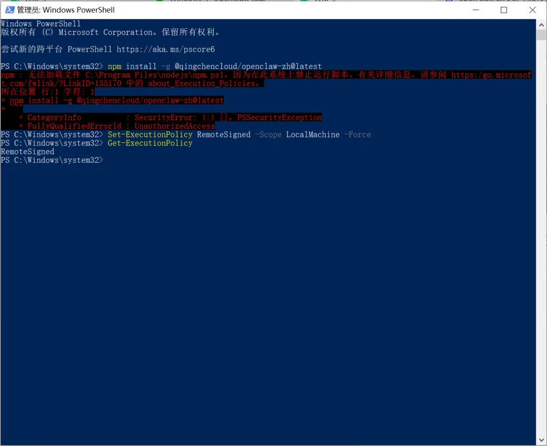 设置全局执行策略为RemoteSignedSet-ExecutionPolicy RemoteSigned -Scope LocalMachine -Force# 验证策略是否生效 Get-ExecutionPolicy