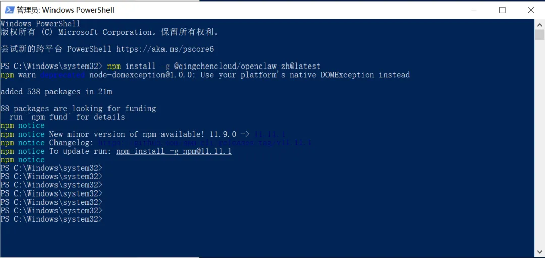 保持管理员身份的 PowerShell 窗口打开,粘贴命令