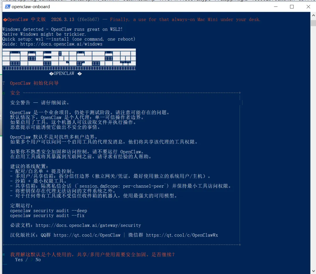 1,界面会提示相关风险,这里必须选择 Yes 并回车