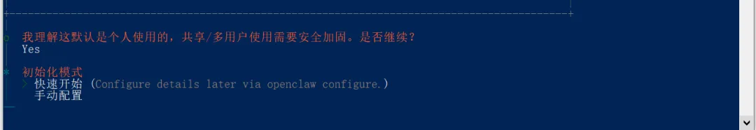 2,接下来选择「快速开始」并回车,后续想精细配置的话,之后还能在 Web 界面调整