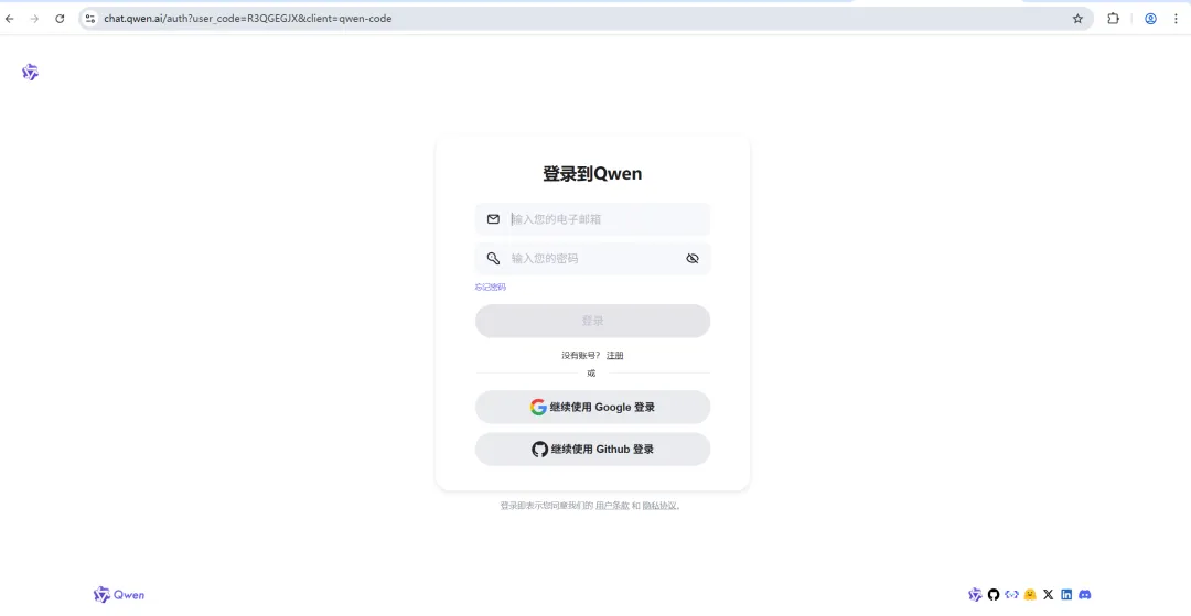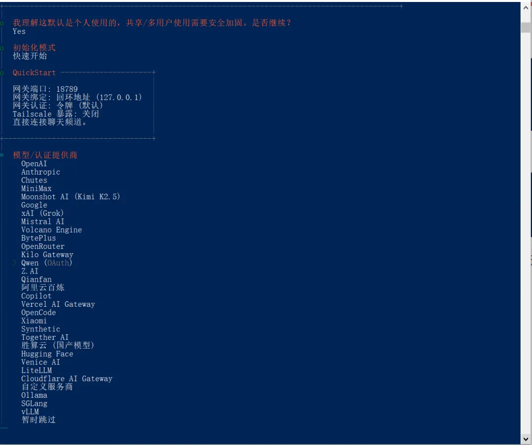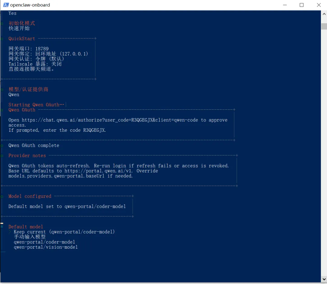 3,选择大模型提供商,我这里选择阿里千问(Qwen)为例,选中后回车,再在认证方式中选择通义千问 OAuth 并回车,此时 PowerShell 会进入等待授权状态,同时浏览器会自动打开