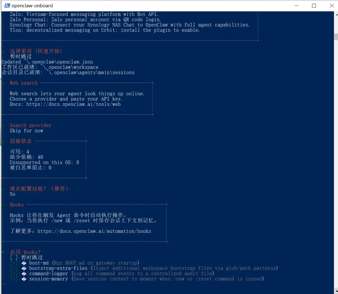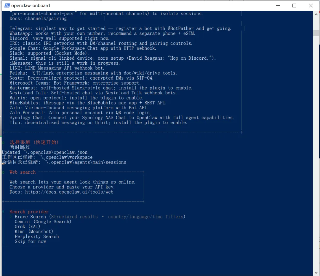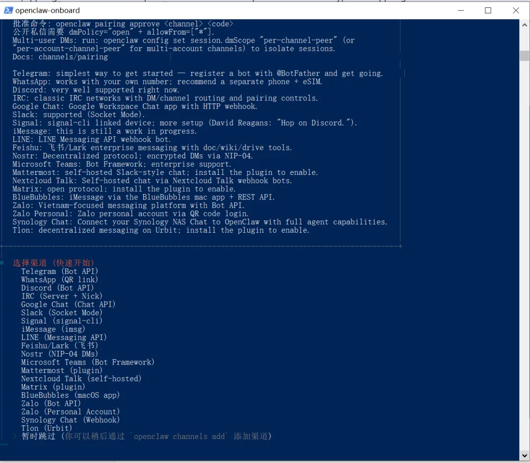 5,接下来选择渠道环节,直接选「暂时跳过」,后续可以用命令添加