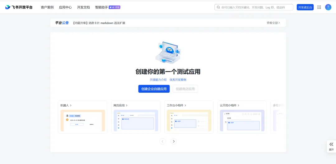 用浏览器打开飞书的开放平台:https://open.feishu.cn/app?lang=zh-CN