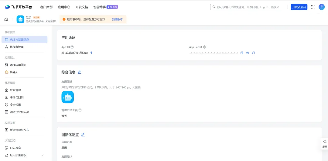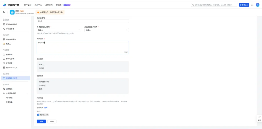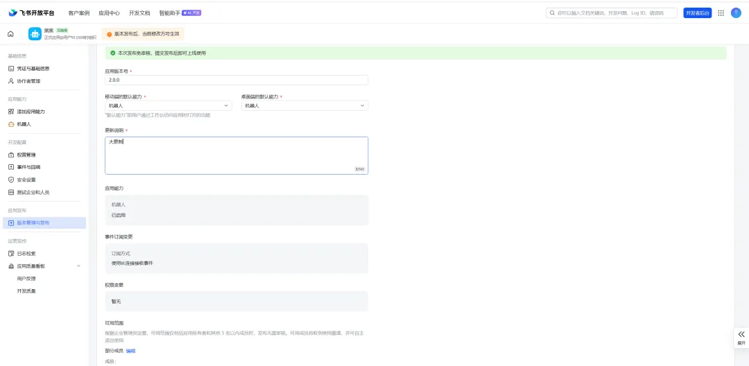 回到"版本管理与发布"页面,点"创建版本",然后"发布"。