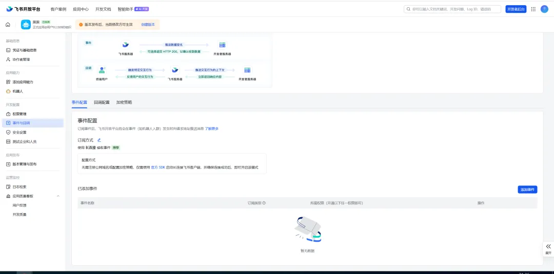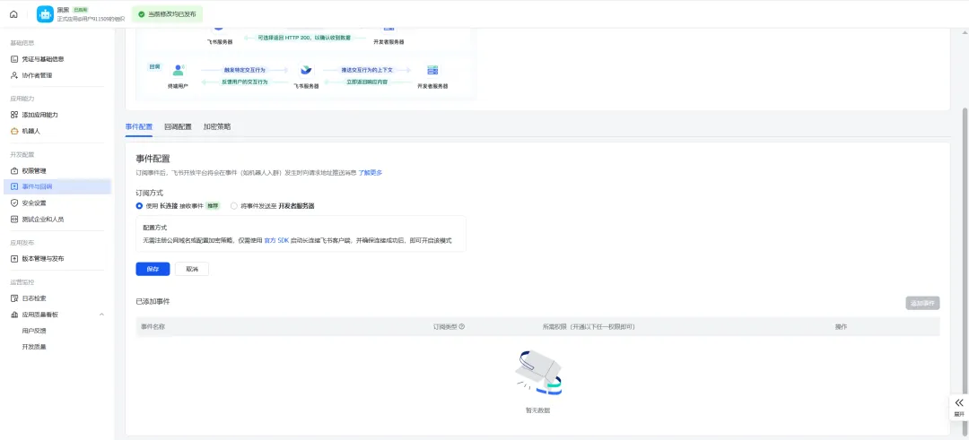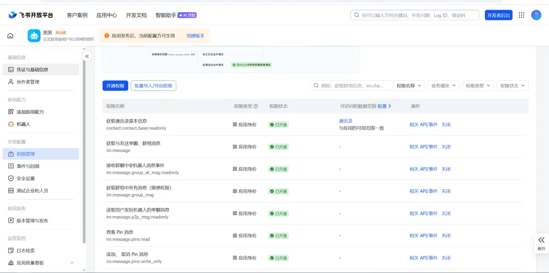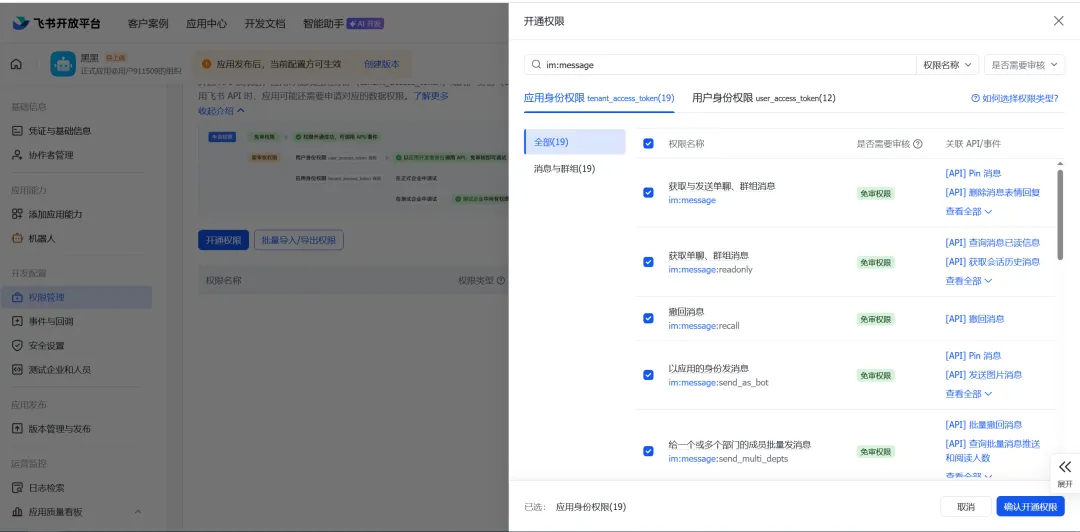 im.message.receive_v1 (必需!收取消息)im.message.message_read_v1 (读取消息标记)im.chat.member.bot.added_v1 (机器人被添加到群组)im.chat.member.bot.deleted_v1 (机器人被从群组移除)