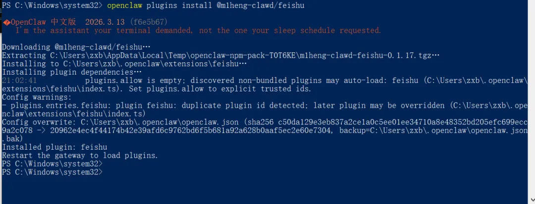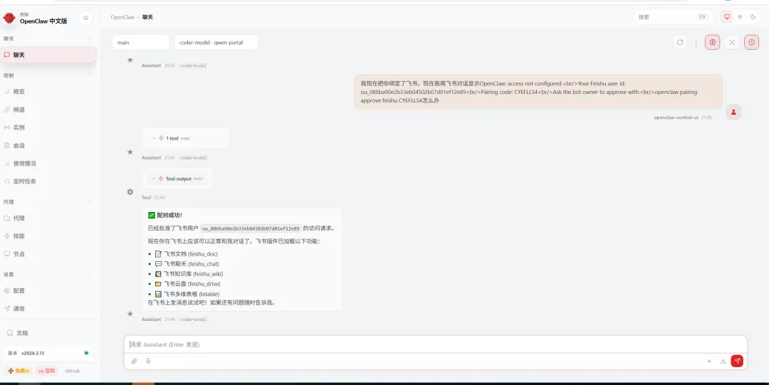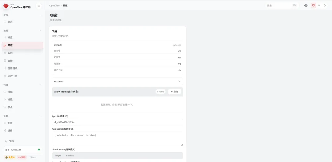 openclaw config set channels.feishu.appId "你的App ID"openclaw config set channels.feishu.appSecret "你的App Secret"openclaw config set channels.feishu.enabled true
