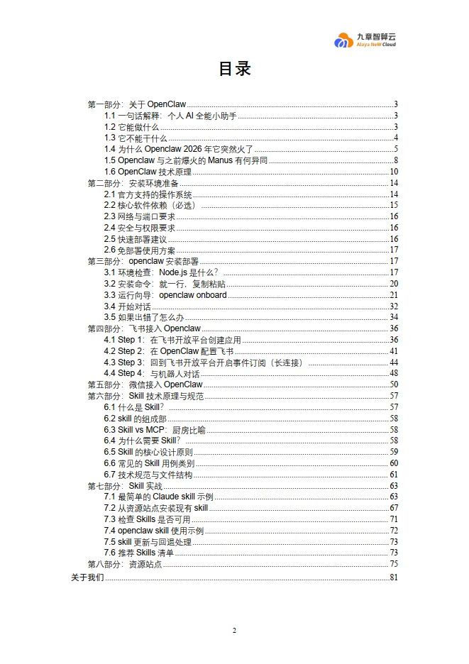文档提供了详细的环境准备(需Node.js 22.x及以上版本等)和分步部署指南。核心是通过 npm install -g openclaw@latest命令安装,然后运行 openclaw onboard交互式向导进行配置,核心步骤是选择模型提供商(如MiniMax、GPT-4等)并配置API Key。文档特别推荐使用WSL2来规避Windows原生环境下的兼容性问题,并提供了九章智算云容器实例作为免维护的云端部署方案。