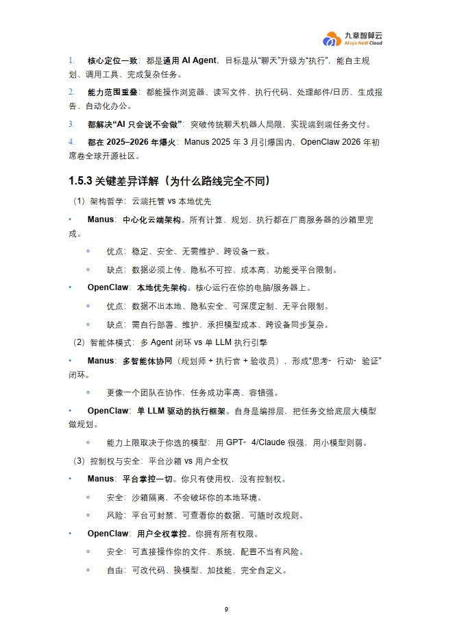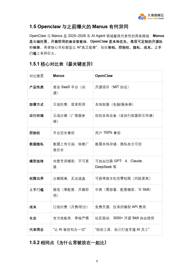 文档详细对比了OpenClaw与2025年爆火的Manus,总结了两条截然不同的技术路线: