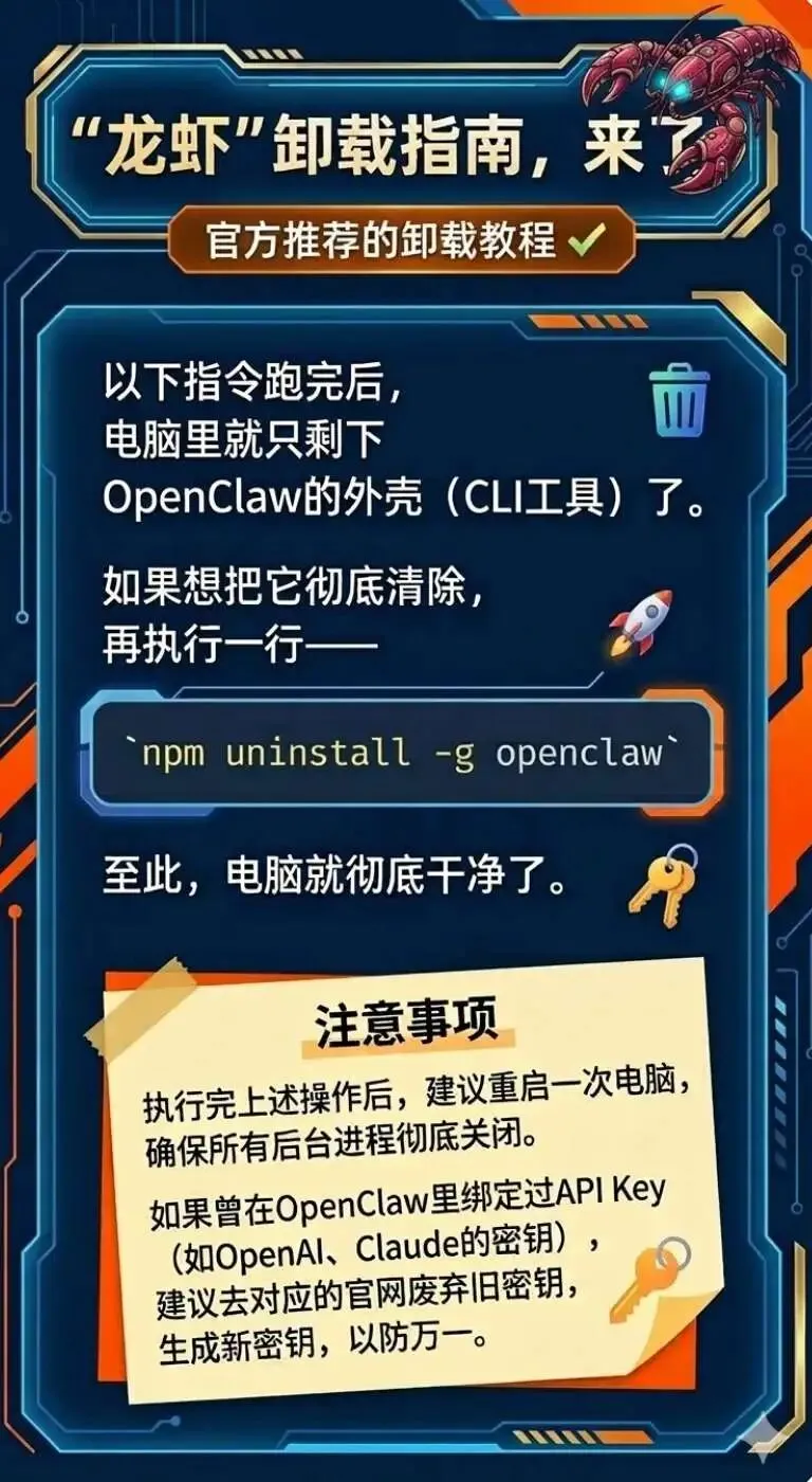 如果不彻底清理,API密钥、配置文件、工作区数据可能还残留在你电脑里。