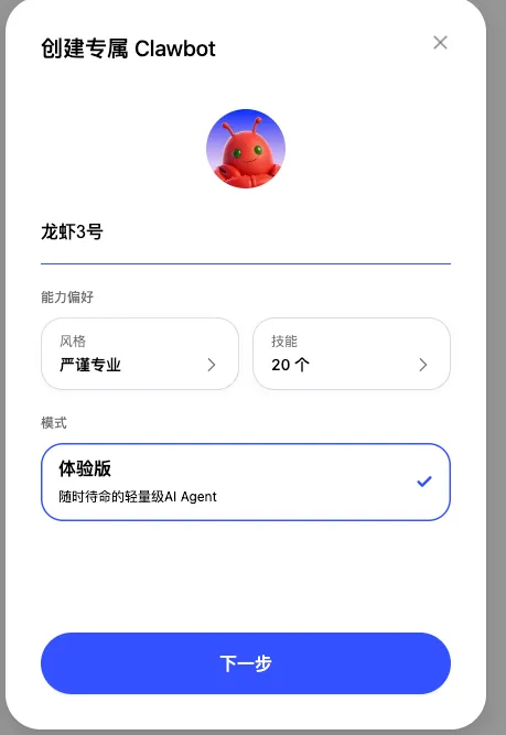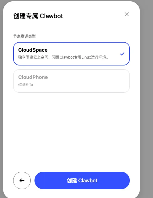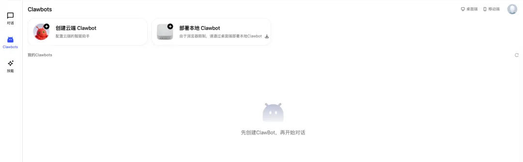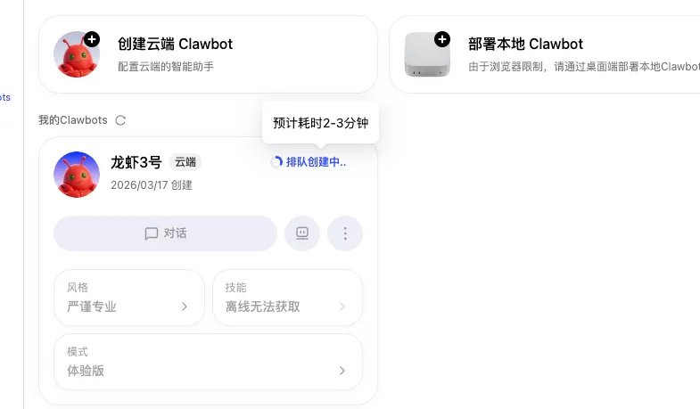 有了邀请码进入页面后,你会发现界面非常简洁明了。直接点击去创建一个新的“龙虾”服务:可以创建云端的,也可以部署本地。这里我选择创建云端 Clawbot
