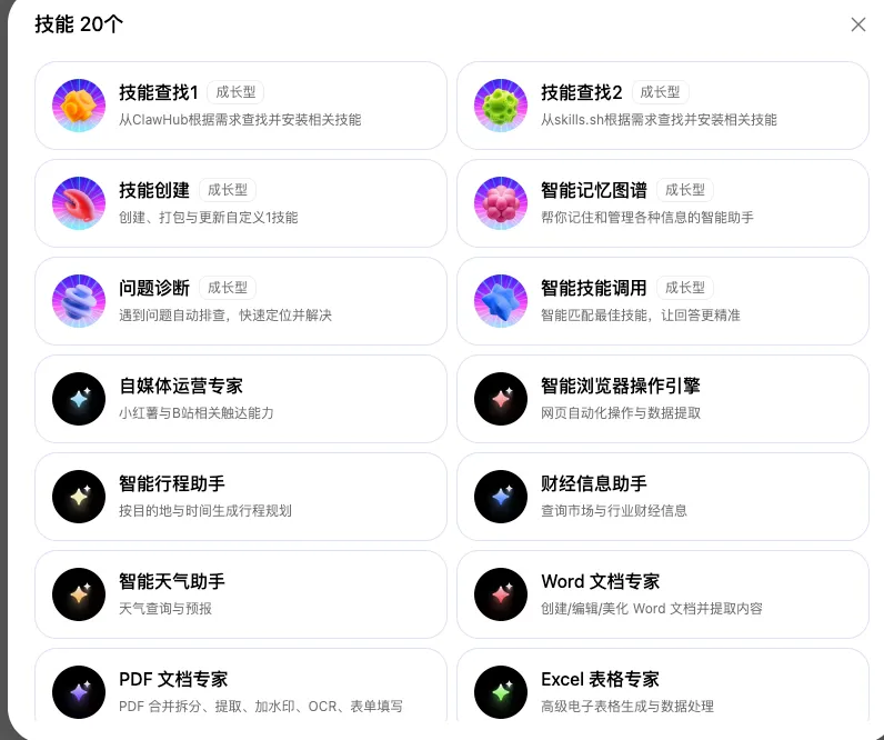 内置了 20 个技能