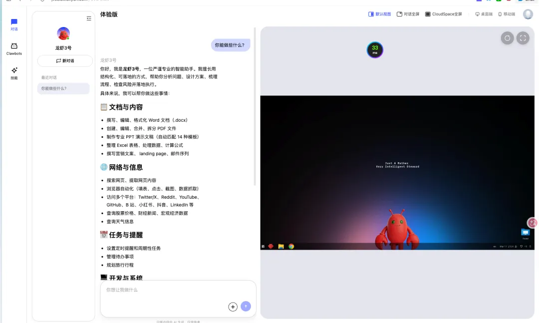 首先,打开对话页面以后,我惊奇地看到右侧实际上是一台云电脑,不愧是阿里。