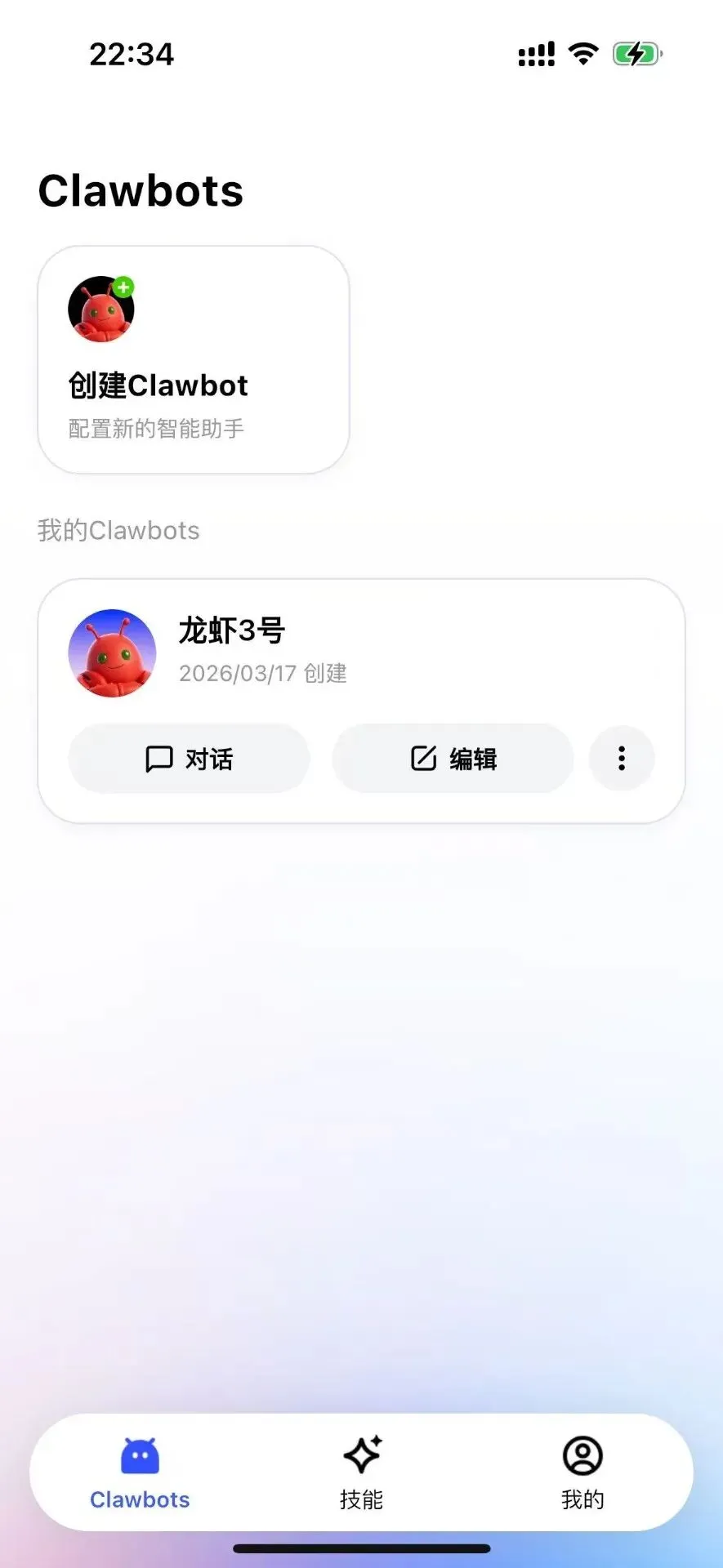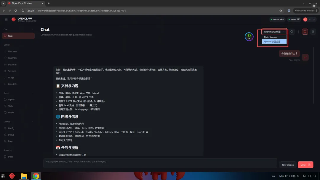 然后你就可以看到,在手机上这个 App 里面的界面实际上是和我们网页的界面差不多的。我们可以直接点击对话,在手机上与你的“龙虾”进行对话了。