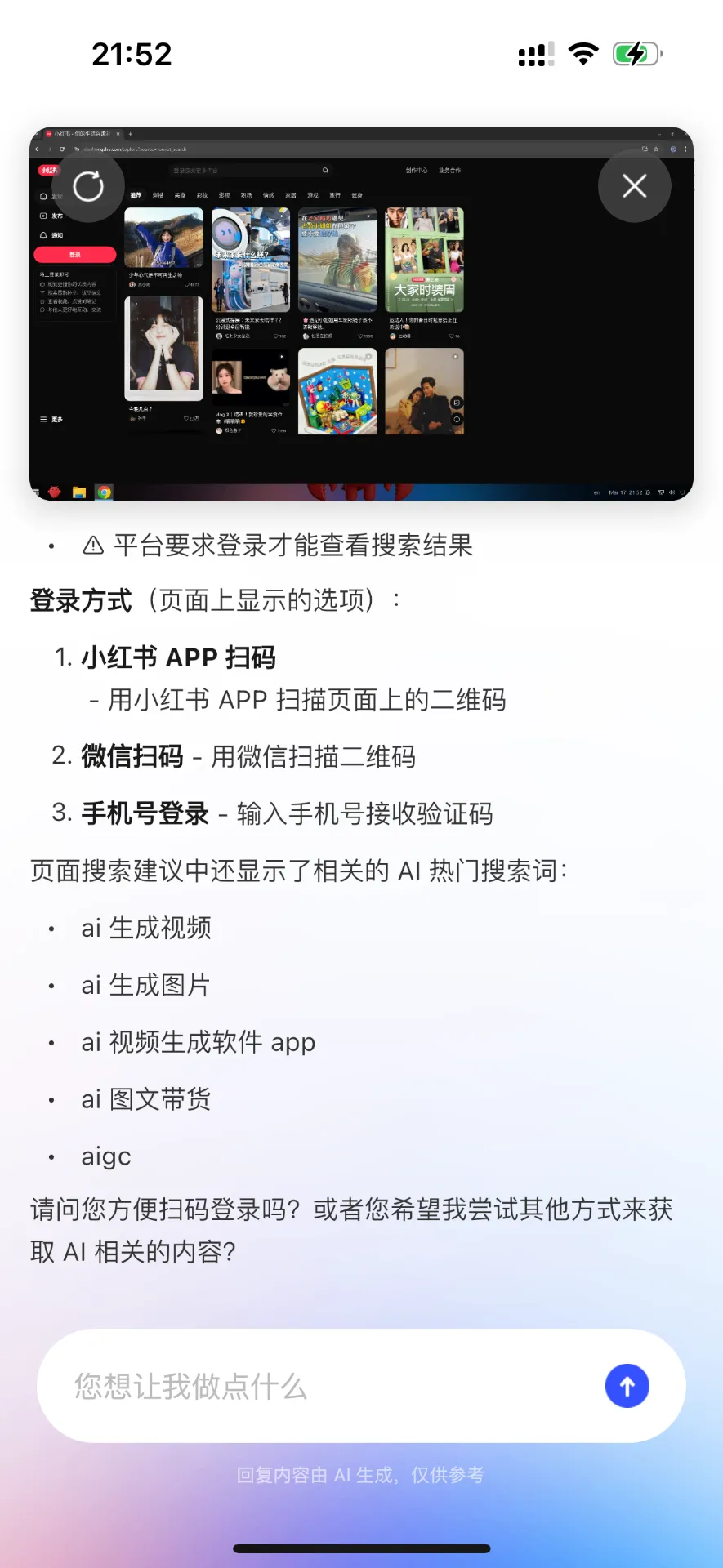 在手机上其实也是能够看到的,手机的最上方有一块区域是用来看当前电脑界面的。我让它去操作小红书,我们可以实时地看到它打开了网页,然后去打开了小红书的页面。