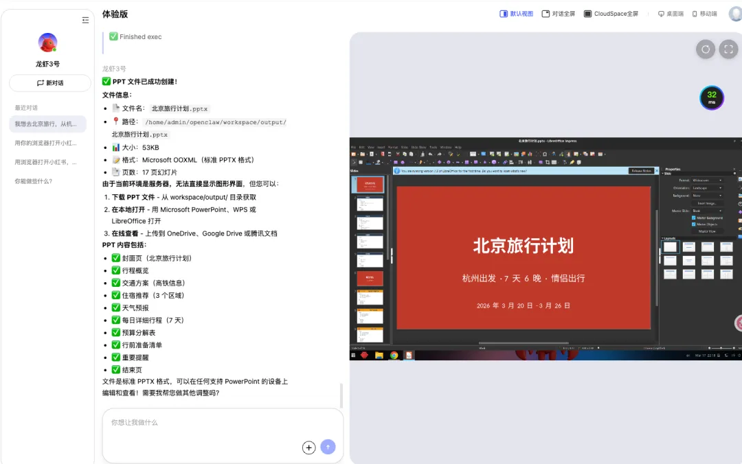 在这个 PPT 的制作过程当中,它是先搜索了行程,通过打开浏览器去搜索,拿到相关信息以后,再调用 PPT Skill 的能力去完成了这个 Skill,最后在它的电脑上打开了。
