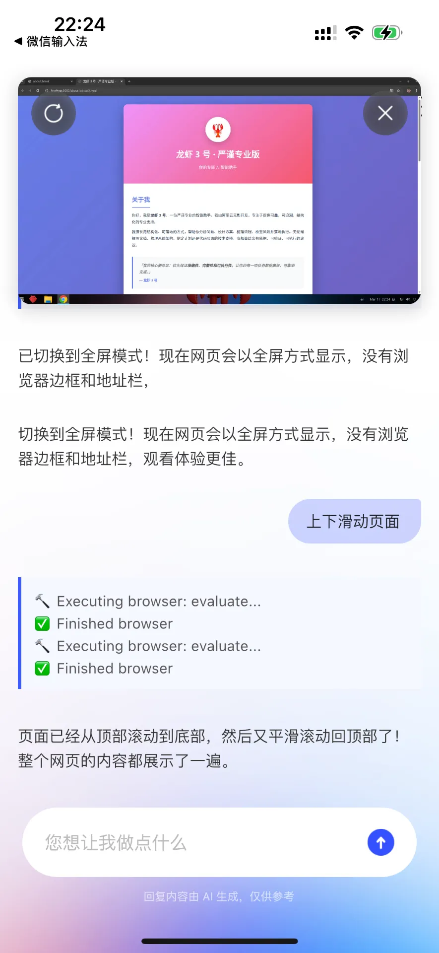 最后我在手机上去操作它,让它自动生成一个网页来展示介绍一下它自己。