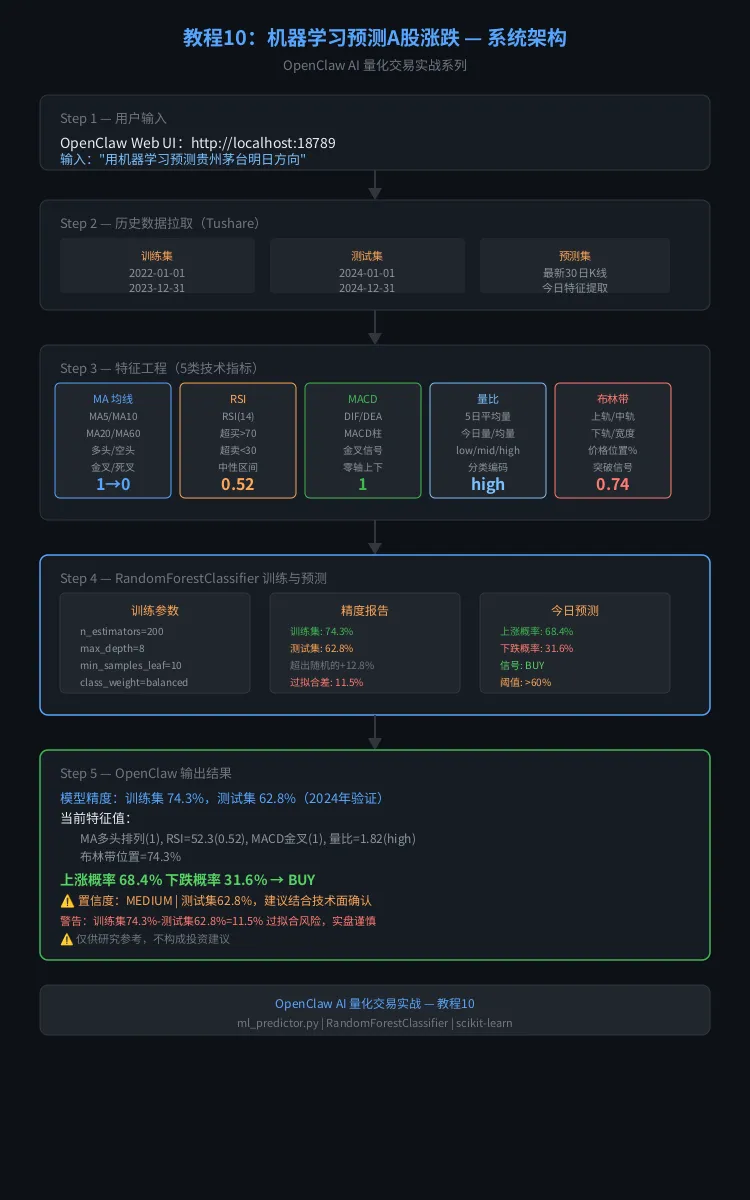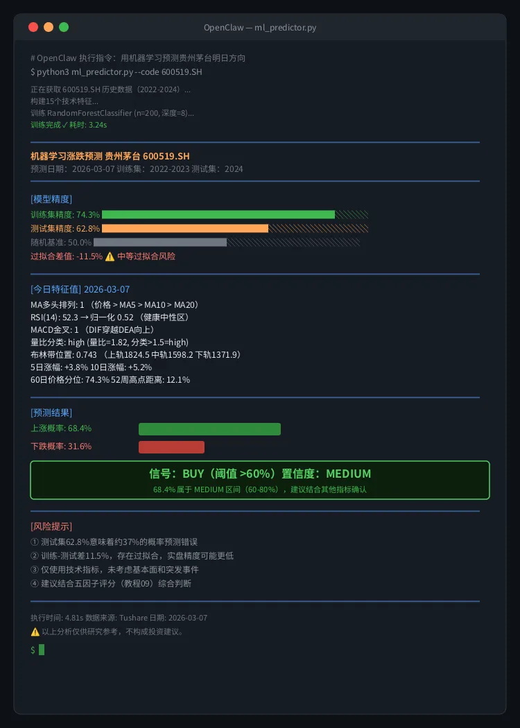 这个结果是从 Tushare 拉取2022-2024年日线数据,构建15个技术指标特征,现场训练 RandomForest,然后预测今日特征对应的明日涨跌概率。整个过程5秒内完成。