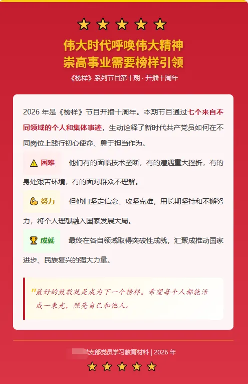 最终成果: 9 张《榜样》第十期奋斗故事卡片 + 村级工作知识卡片!每张都包含: