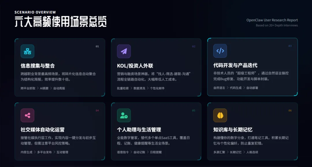 我们找到了6位高频用户(开发者、运营、创业者)每人进行了30-100分钟的1v1对话,深度拆解他们在日常生活和工作流中是如何使用 OpenClaw 的。
