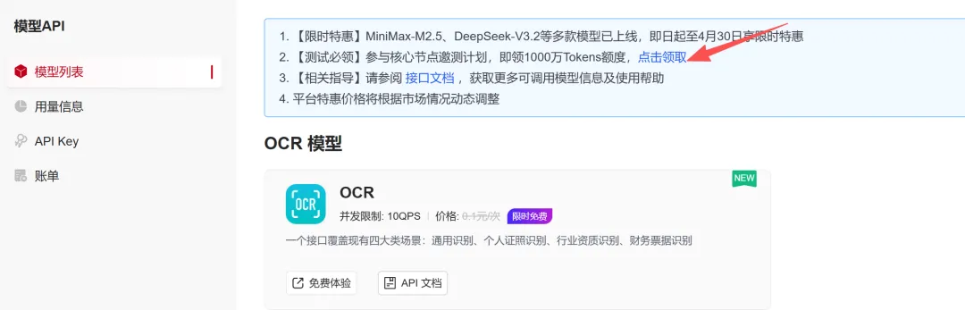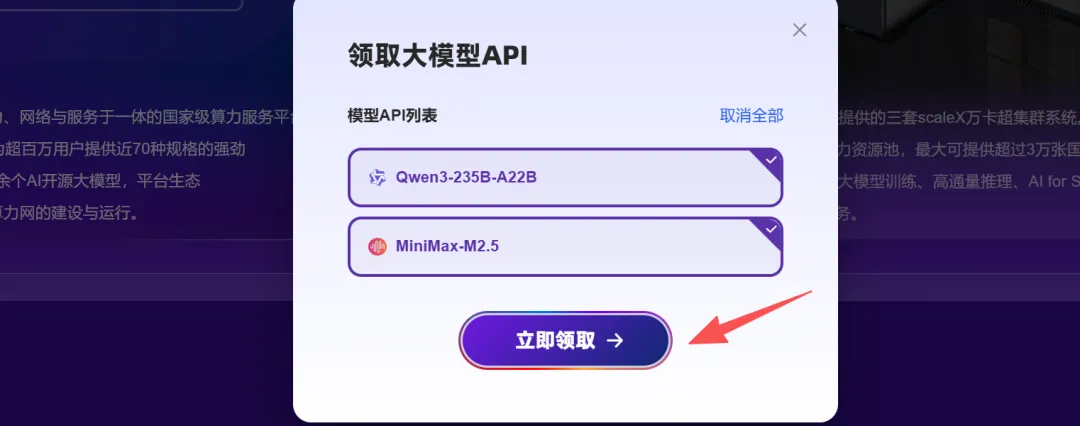 这个时候又会有两个模型可以选择,分别是Qwen3-235B-A22B和MiniMax-M2.5, 我们把两个都勾选上, 然后点击立即领取。