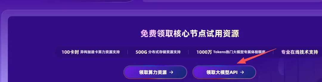点击领取,会跳转到邀请测试页面,在下方有一个免费领取核心节点试用资源的板块,上面有两种资源可以领,一种的算力资源,另外一种是大模型API,我们选择领取大模型API。