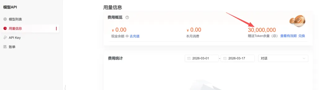 领取成功之后,便可以到API控制台上查看Tokens,可以看到3000W的Tokens已经到手了,是不是真香?