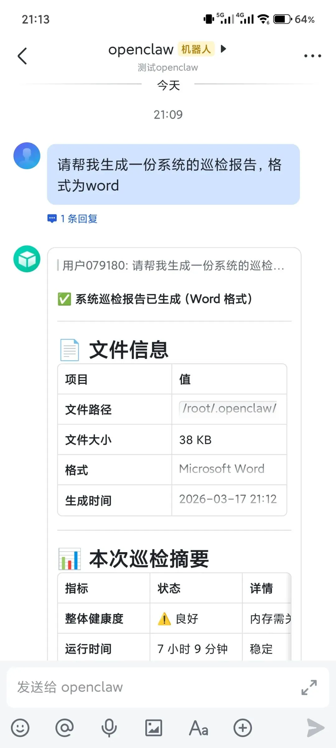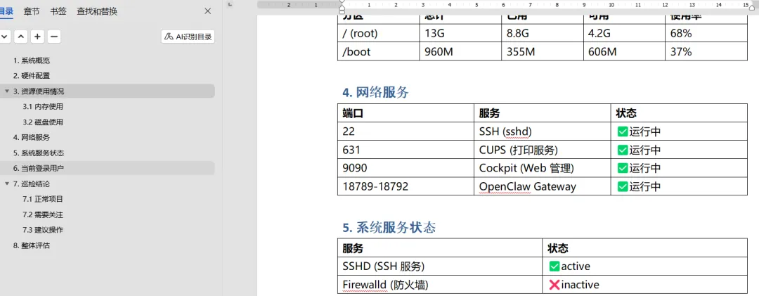 在演示飞书对接功能时,我尝试让系统自动生成一份完整的巡检报告,结果确实令人惊叹——整个流程完全无需人工干预,OpenClaw 能够自主执行指令并编写脚本,最终高效生成所需的报告。
