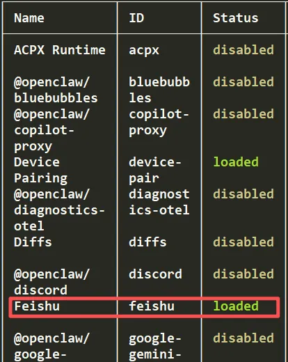 openclaw plugins install @larksuiteoapi/feishu-openclaw-plugin@latest查看飞书插件的状态, 确保是loaded状态