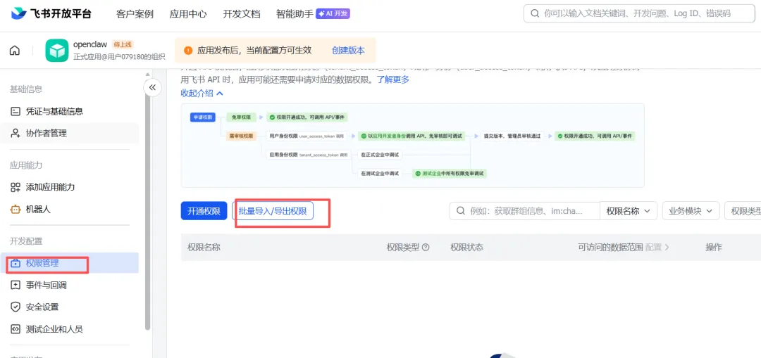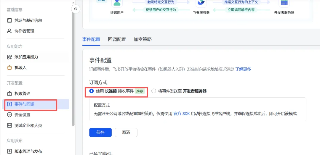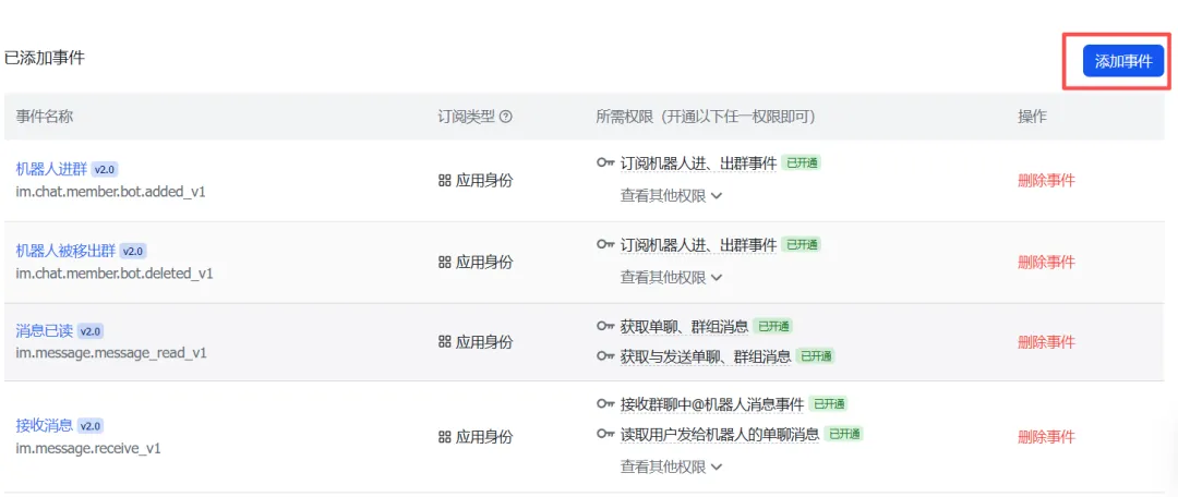 JSON{"scopes": { "tenant": [ "aily:file:read", "aily:file:write", "application:application.app_message_stats.overview:readonly", "application:application:self_manage", "application:bot.menu:write", "cardkit:card:read", "cardkit:card:write", "contact:contact.base:readonly", "contact:user.employee_id:readonly", "corehr:file:download", "event:ip_list", "im:chat.access_event.bot_p2p_chat:read", "im:chat.members:bot_access", "im:message", "im:message.group_at_msg:readonly", "im:message.p2p_msg:readonly", "im:message:readonly", "im:message:send_as_bot", "im:resource" ], "user": [ "aily:file:read", "aily:file:write", "im:chat.access_event.bot_p2p_chat:read" ]}}(7) 配置事件订阅