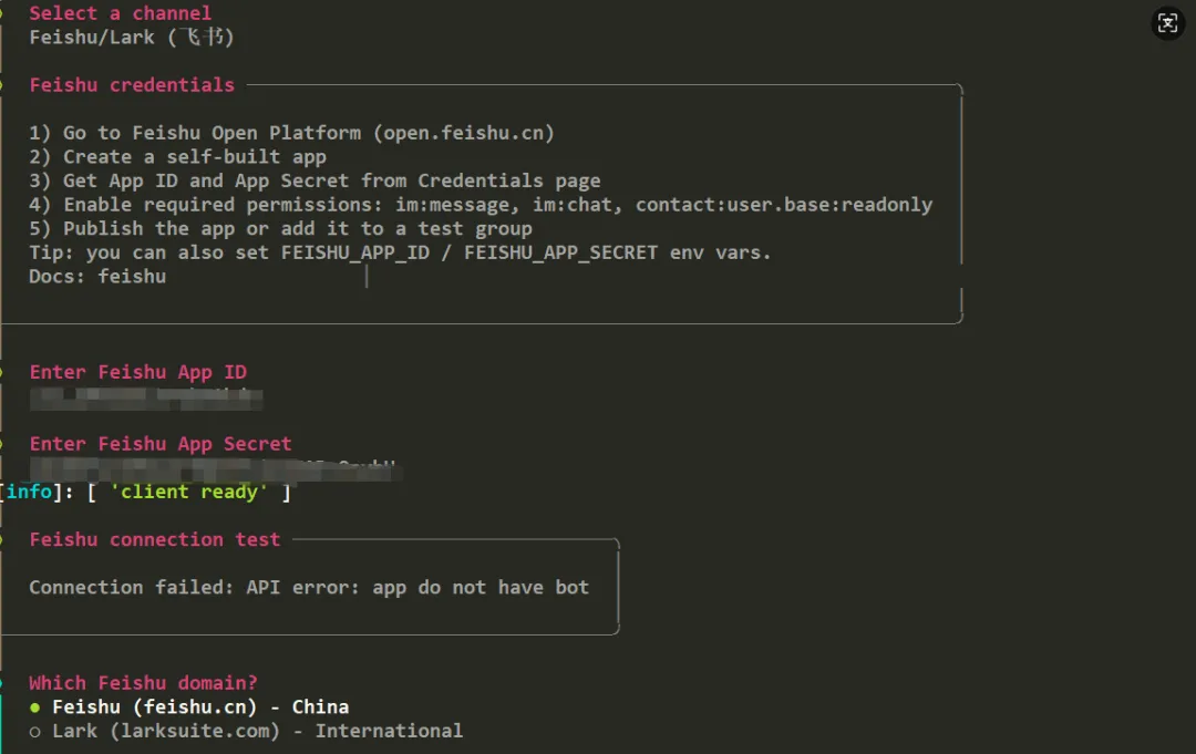 此处需要输入创建的飞书应用的App ID 和 App Secret