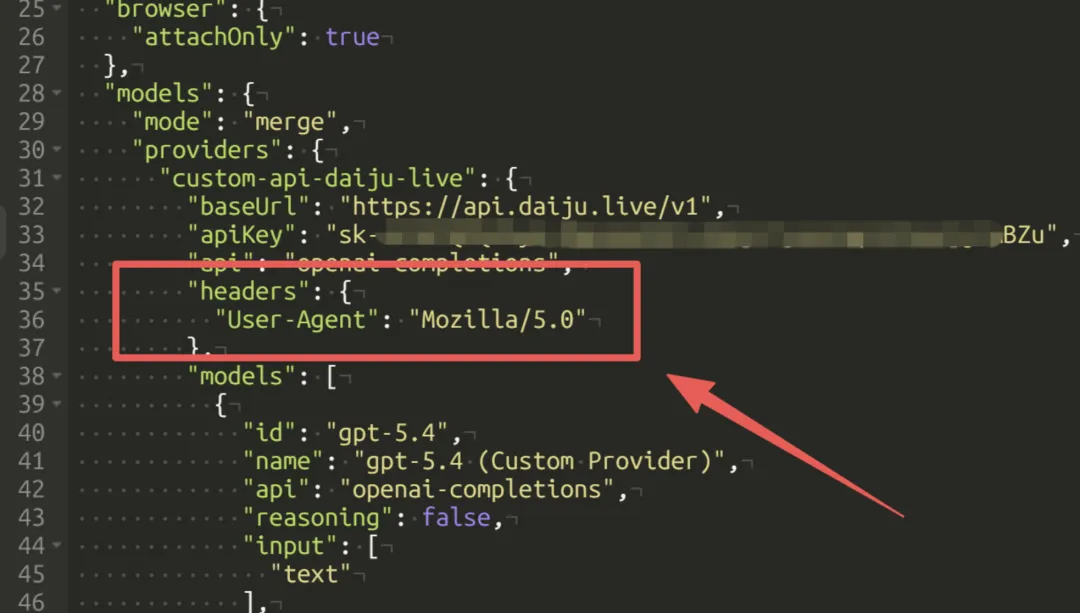 { "models": { "providers": { "free-gpt": { "baseUrl": "https://sub.jlypx.de/v1", "apiKey": "sk-***", "api": "openai-responses", "headers":{"User-Agent":"Mozilla/5.0"} } } } }}然后把默认模型指到你想用的模型(例如先用 gpt-5.2):