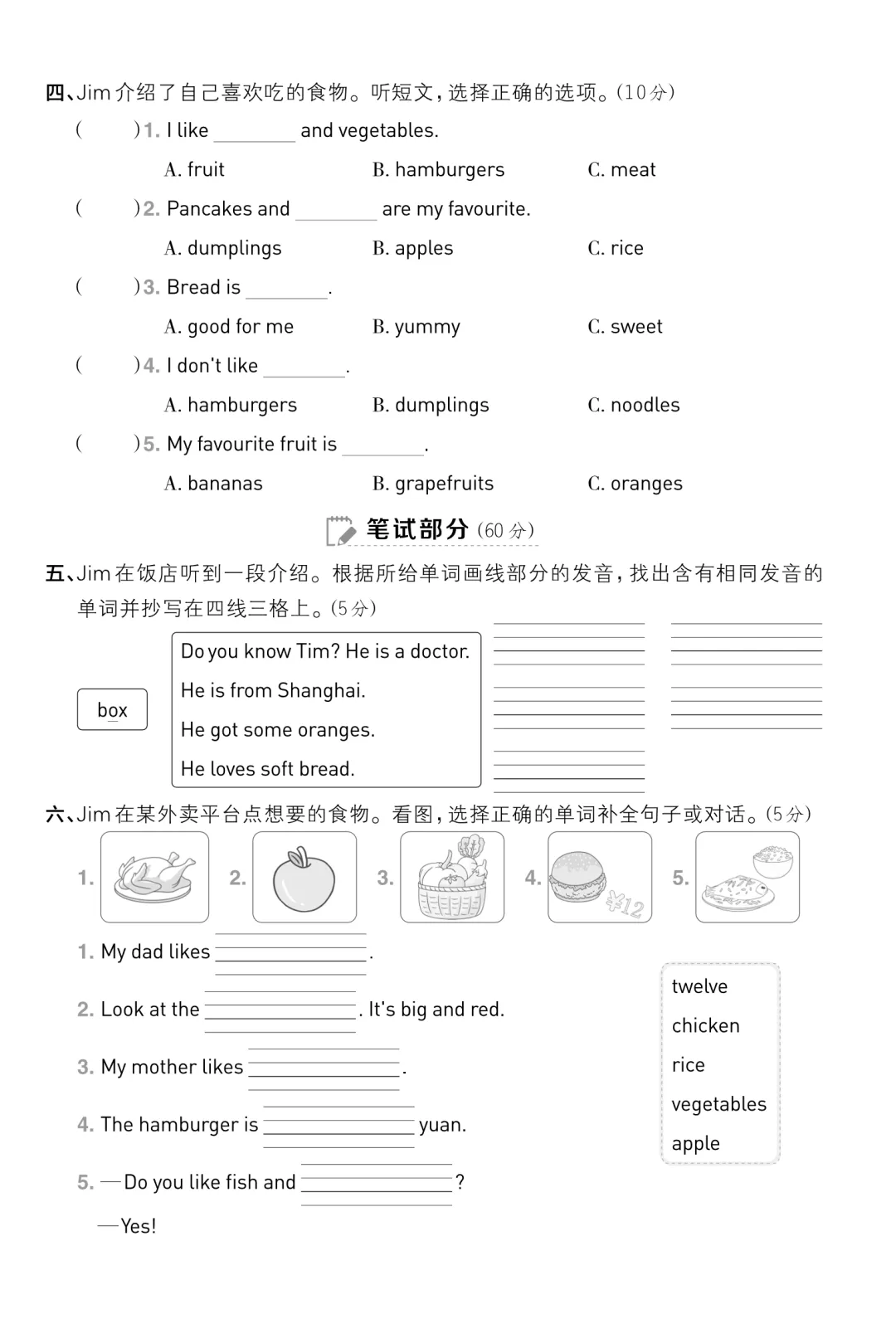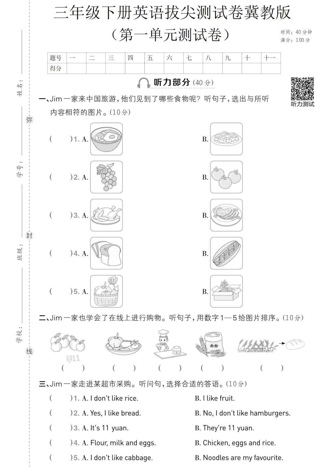 三年级(下)英语 第一单元拔尖测试卷《冀教版》