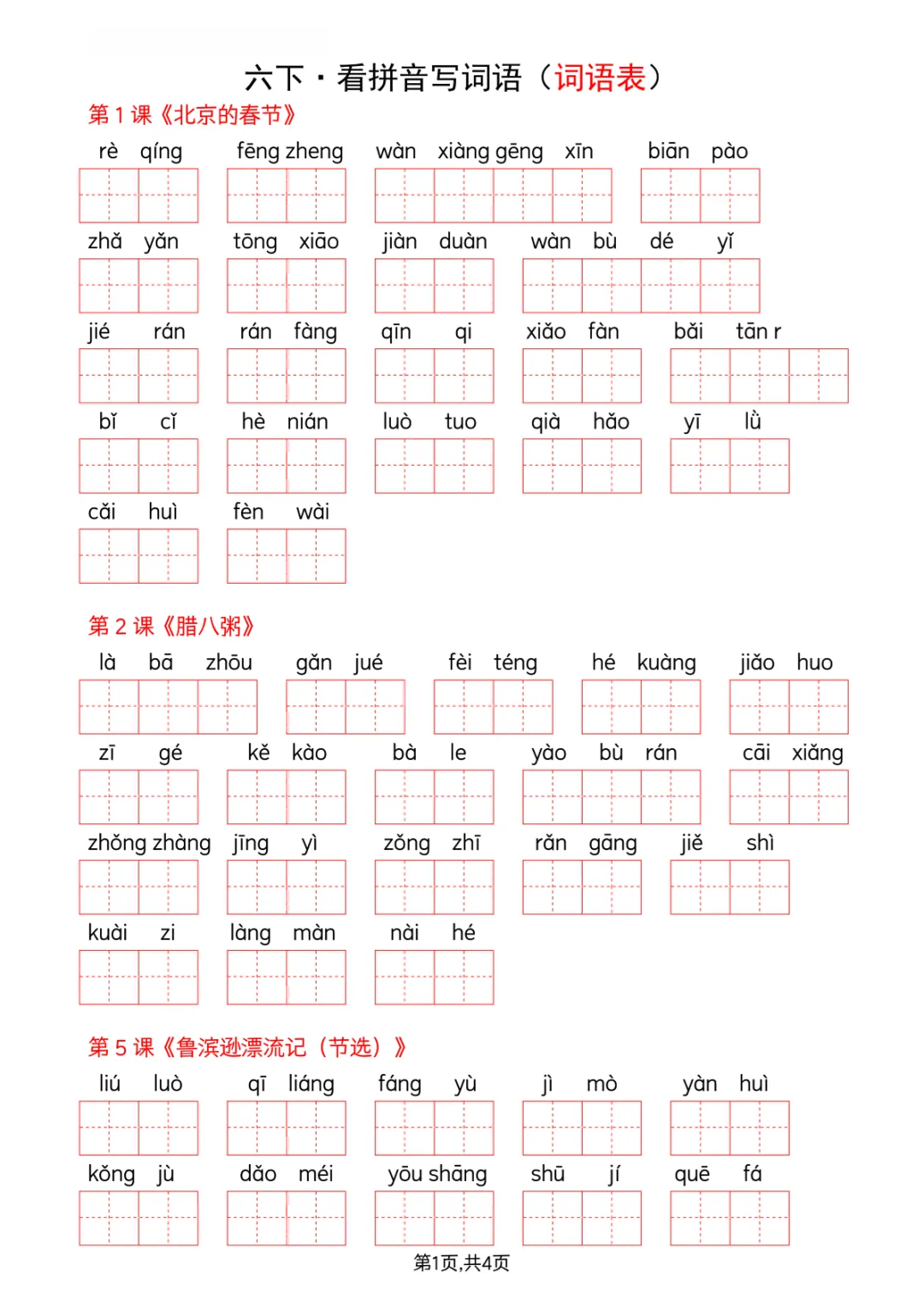 六年级(下)语文 看拼音写词语--词语表