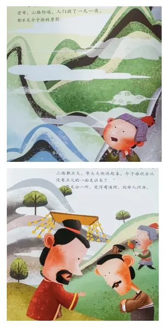 晋文公派人上山搜寻,可绵山丛林密布,山路险峻,人们搜了一天一夜,都不见介子推的身影。有臣子提议说:“不妨放火烧山,在山的三面都点火,等大火燃烧起来,介子推就会从没有点火的一面面走出来了。”晋文公一听,觉得有道理,就命人照办。