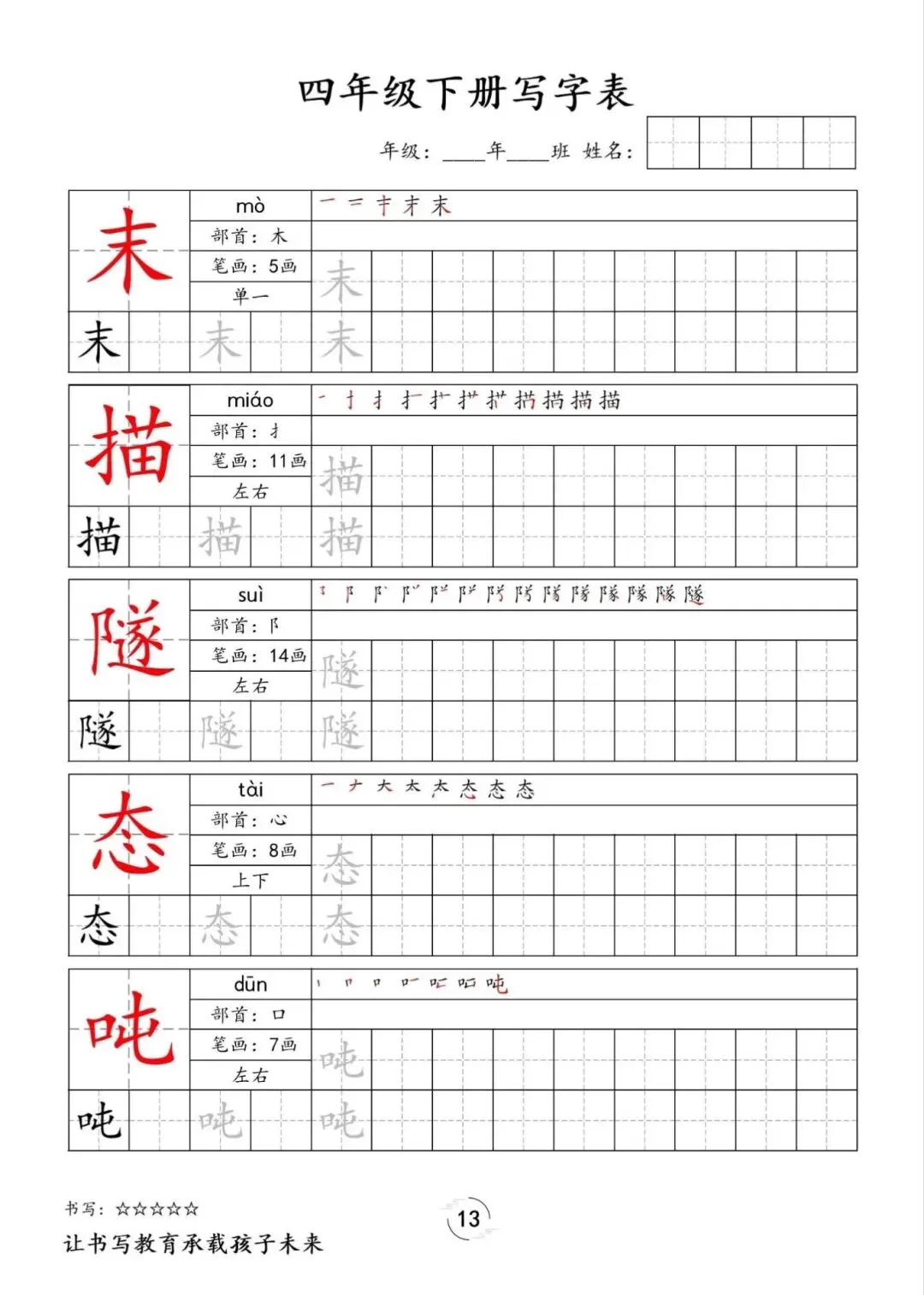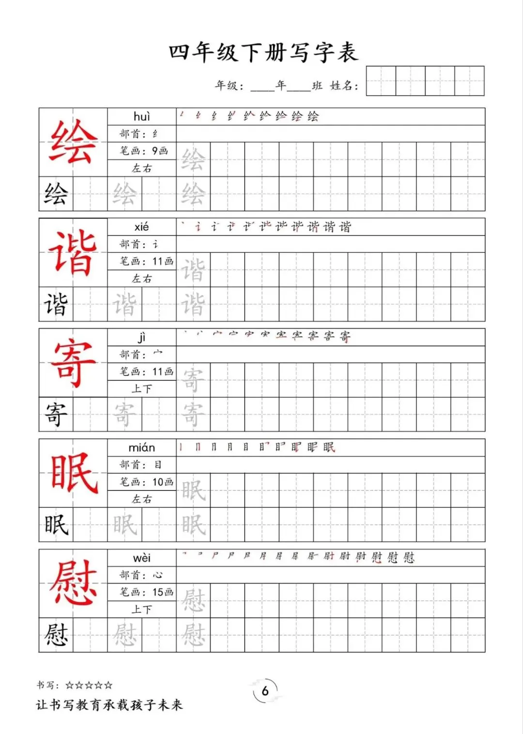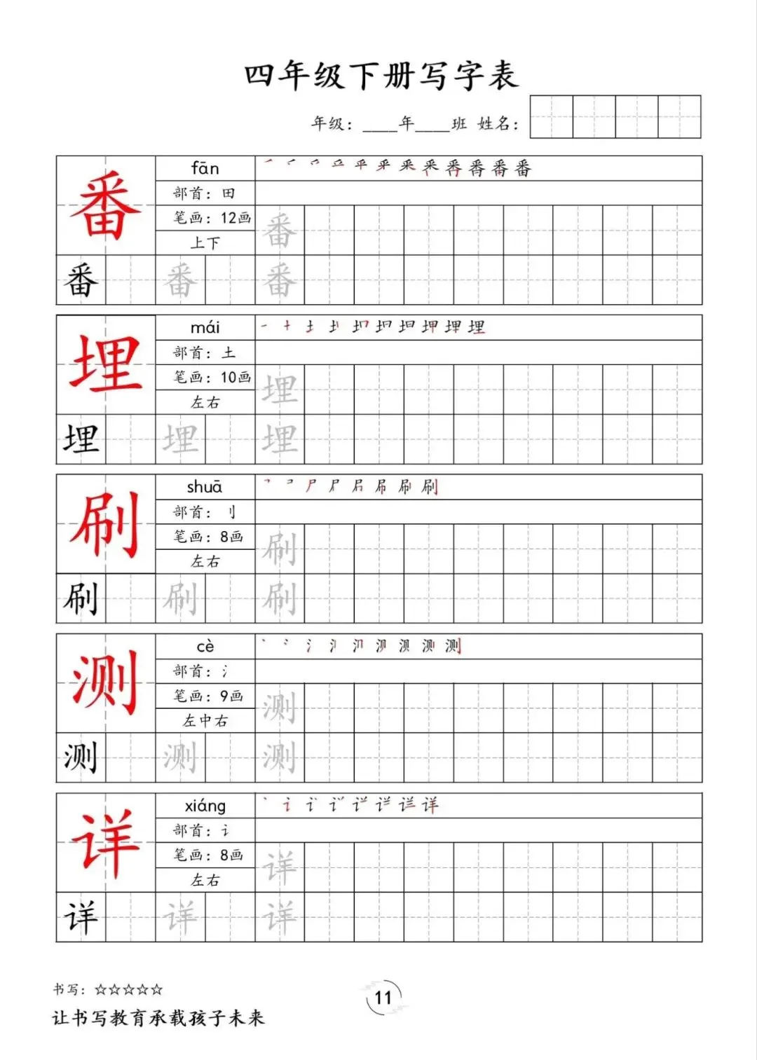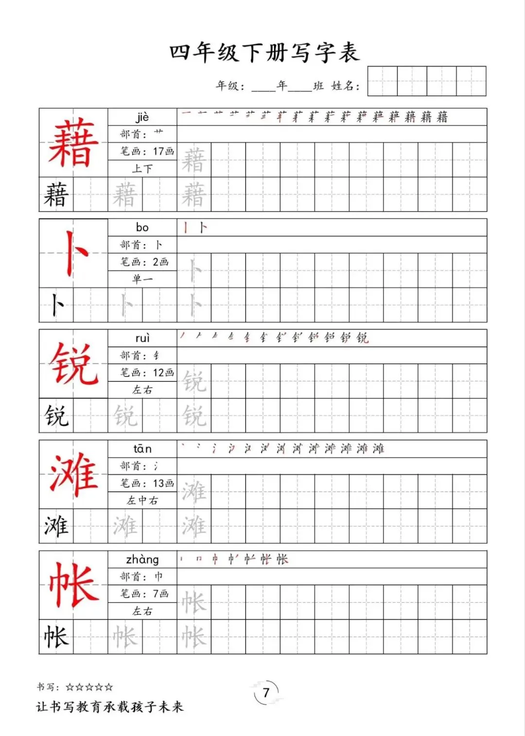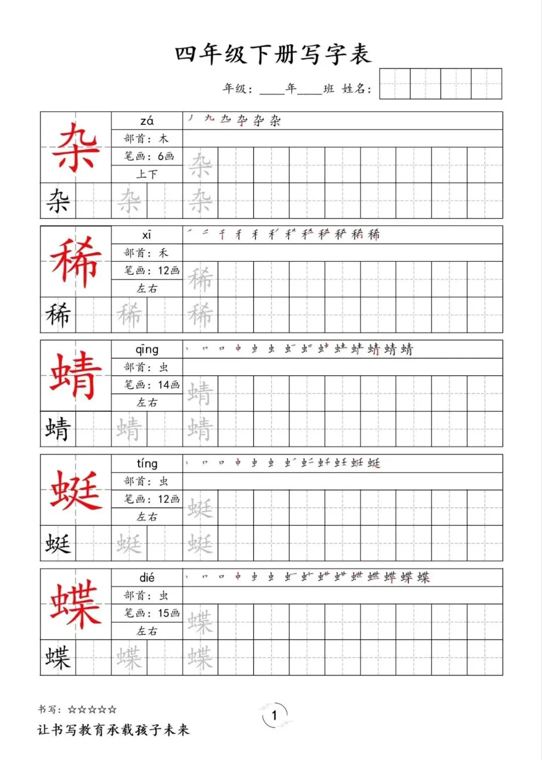 该字帖要求会读、会写、会组词,能掌握正确的笔顺和间架结构,能在田字格中规范书写。孩子可以临摹一遍,再书写一遍,电子字帖可以反复练习,多写几遍,孩子自然而然就记住了。