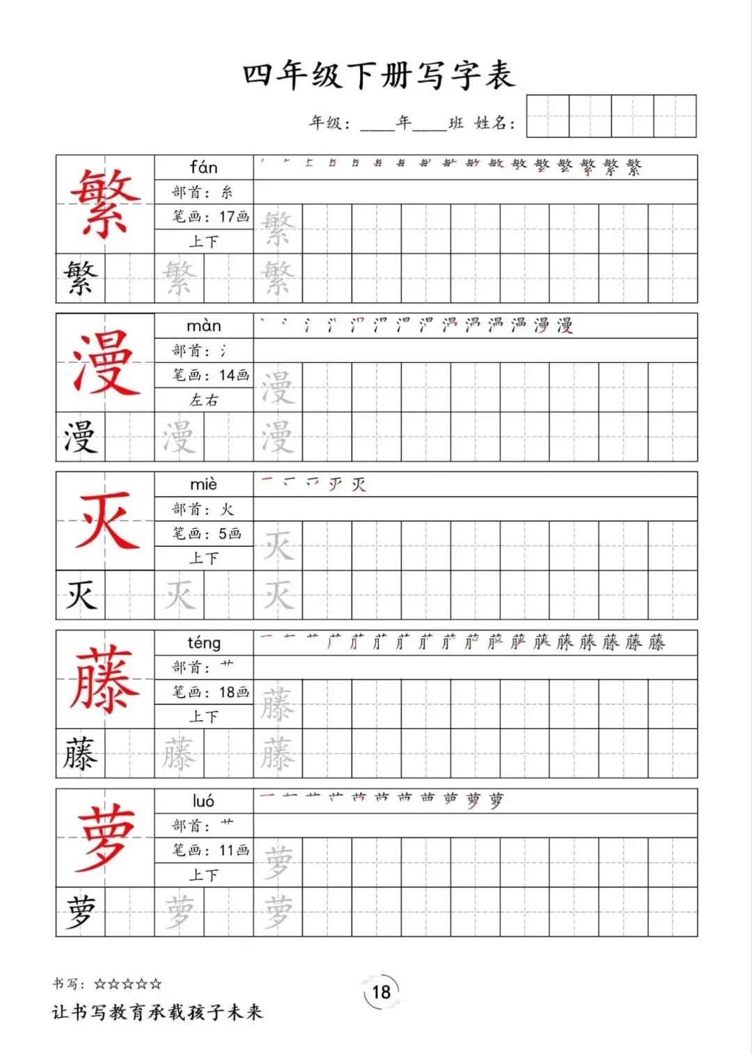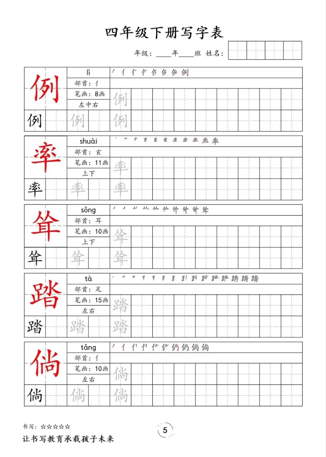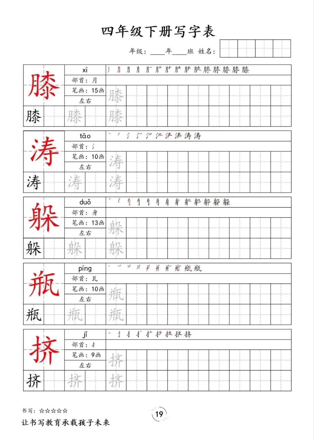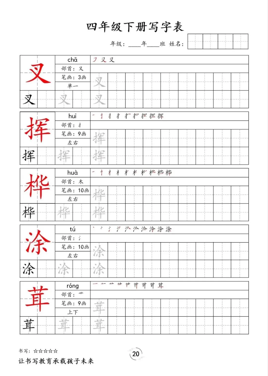 该字帖要求会读、会写、会组词,能掌握正确的笔顺和间架结构,能在田字格中规范书写。孩子可以临摹一遍,再书写一遍,电子字帖可以反复练习,多写几遍,孩子自然而然就记住了。