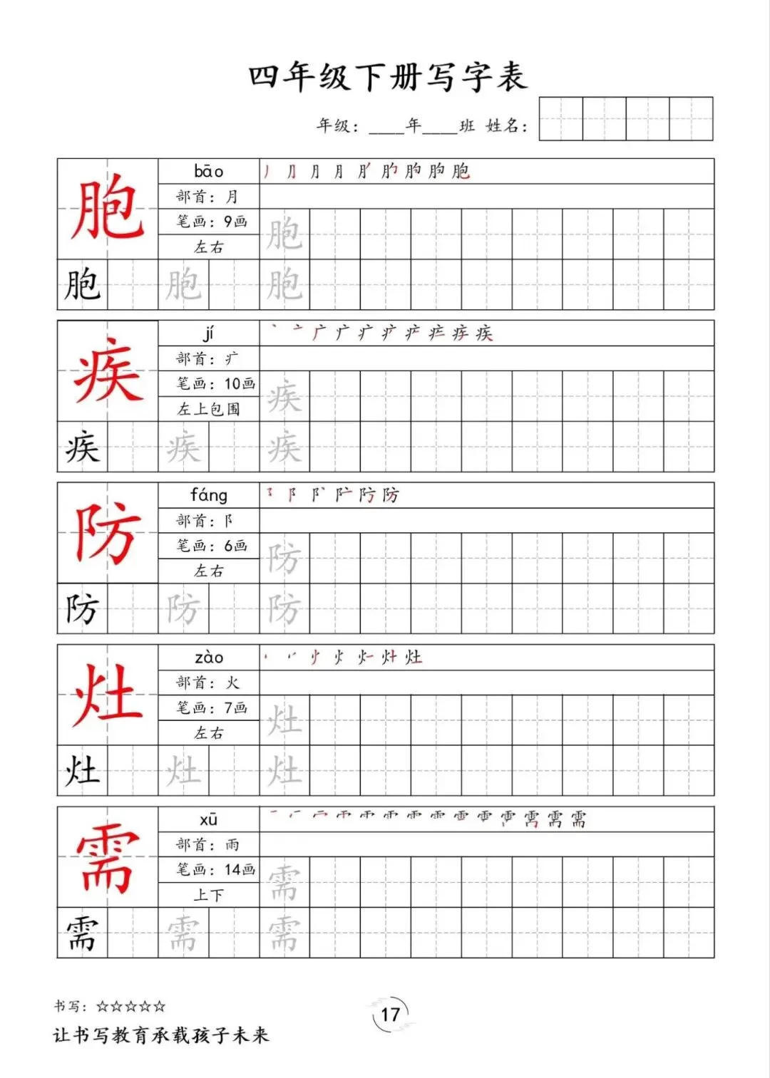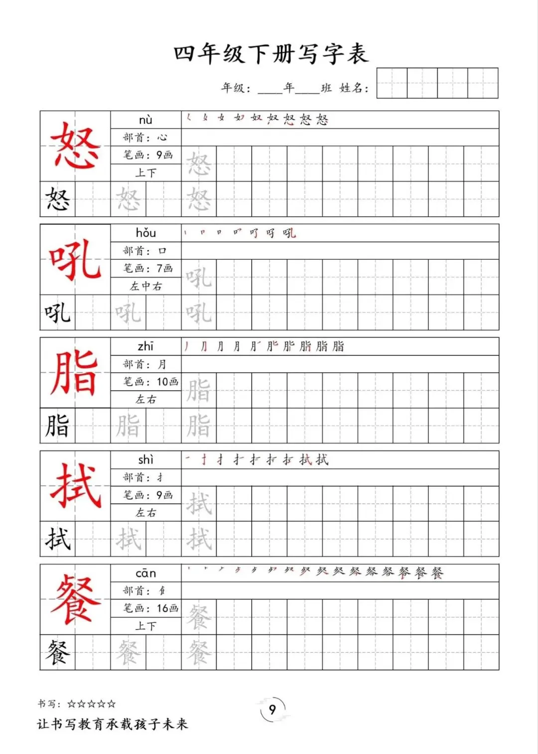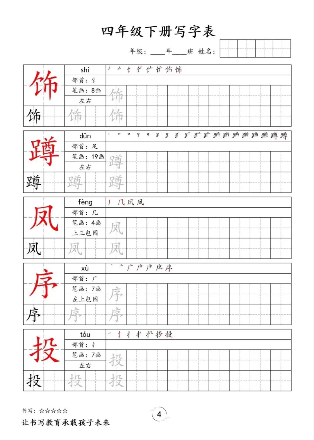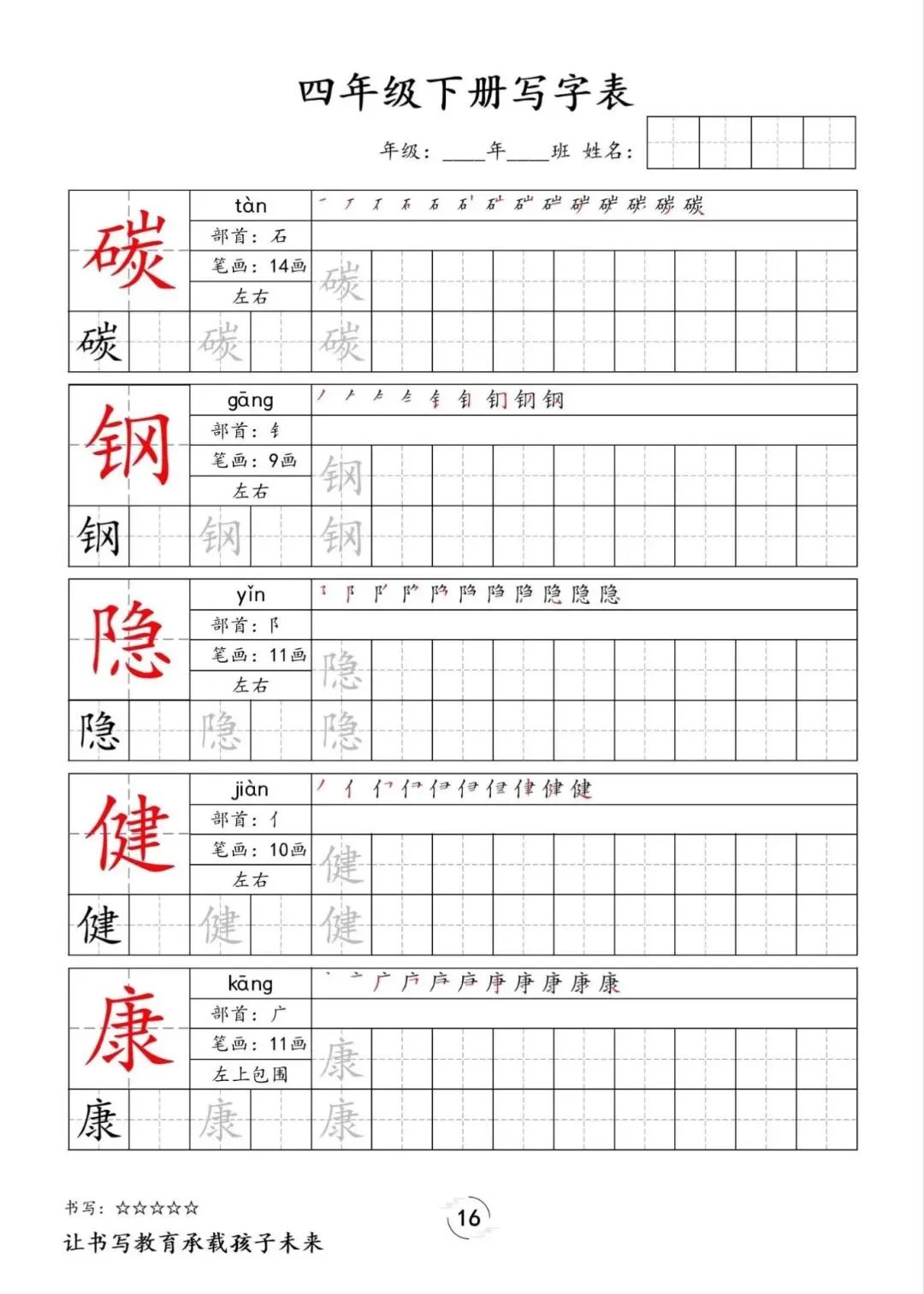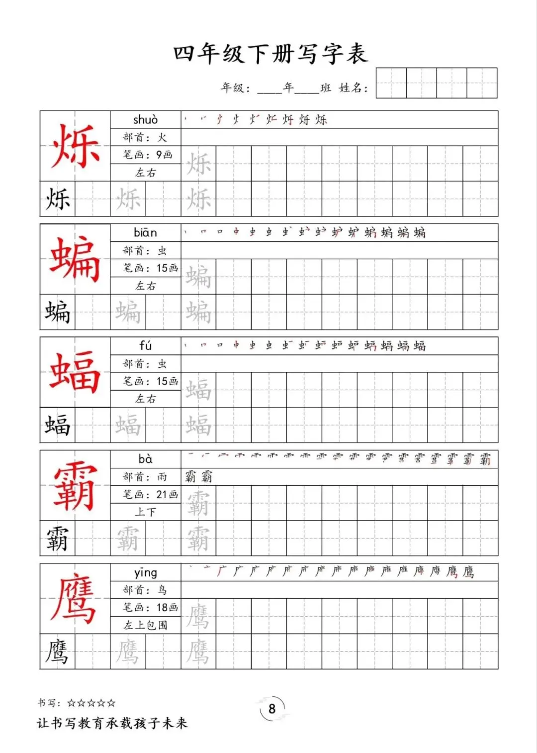 该字帖要求会读、会写、会组词,能掌握正确的笔顺和间架结构,能在田字格中规范书写。孩子可以临摹一遍,再书写一遍,电子字帖可以反复练习,多写几遍,孩子自然而然就记住了。