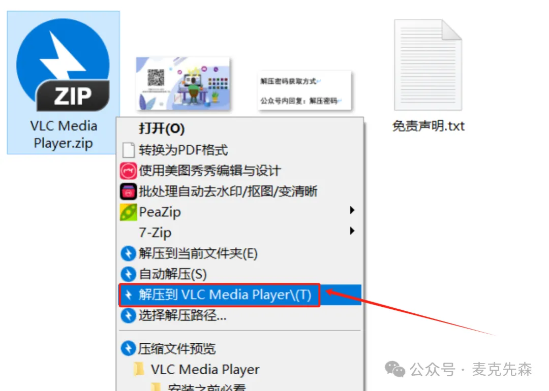 1.打开下载好的文件夹,找到压缩包,鼠标右键选择【解压到VLC Media Player\】。